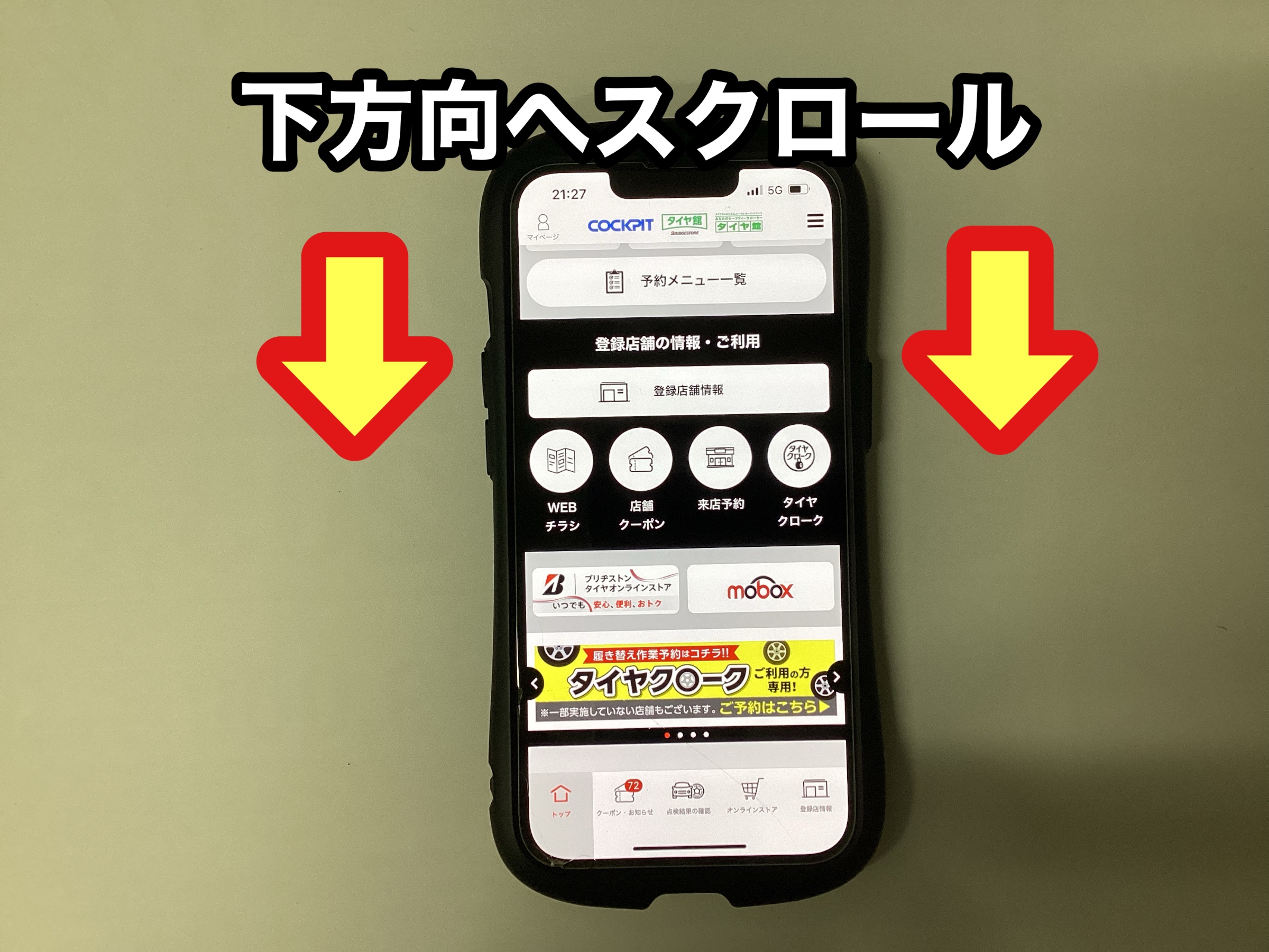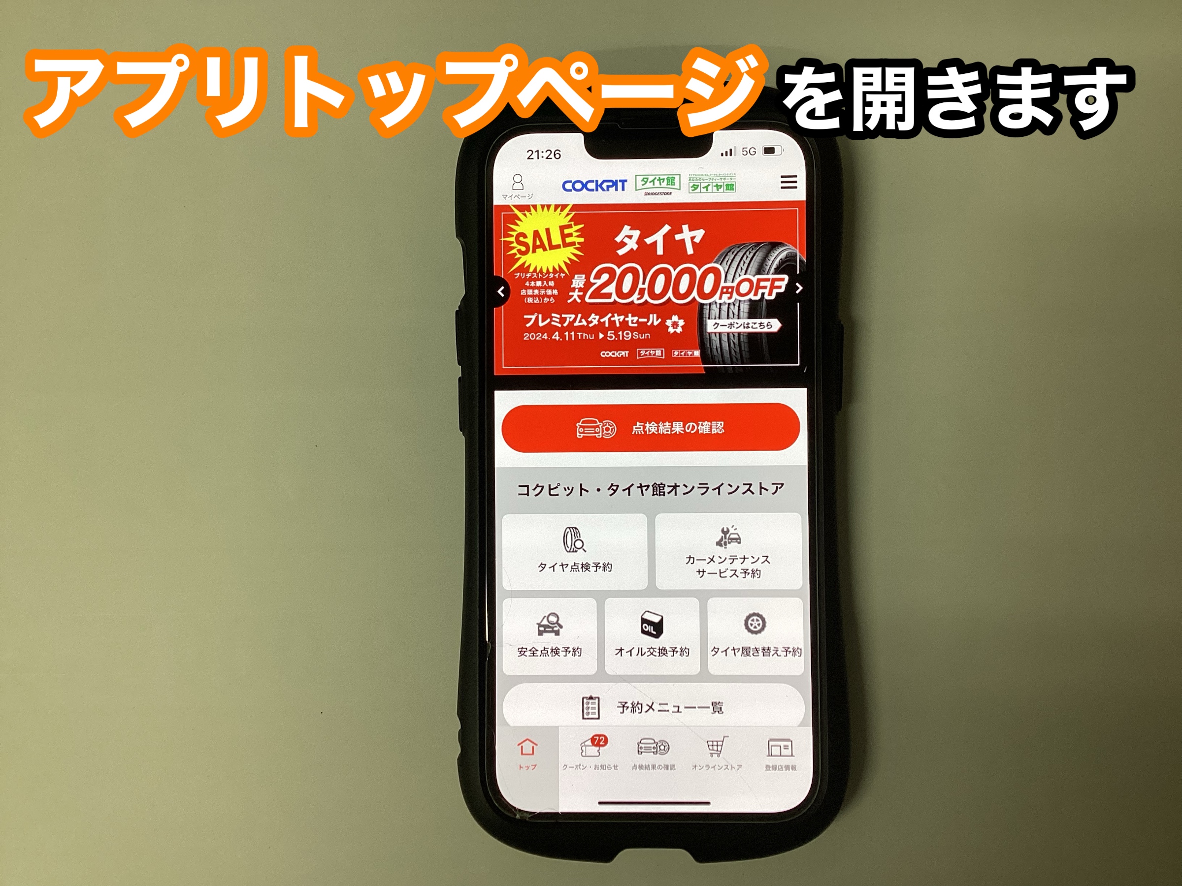まずはタイヤ館アプリを開いていただき、トップページを開きます。