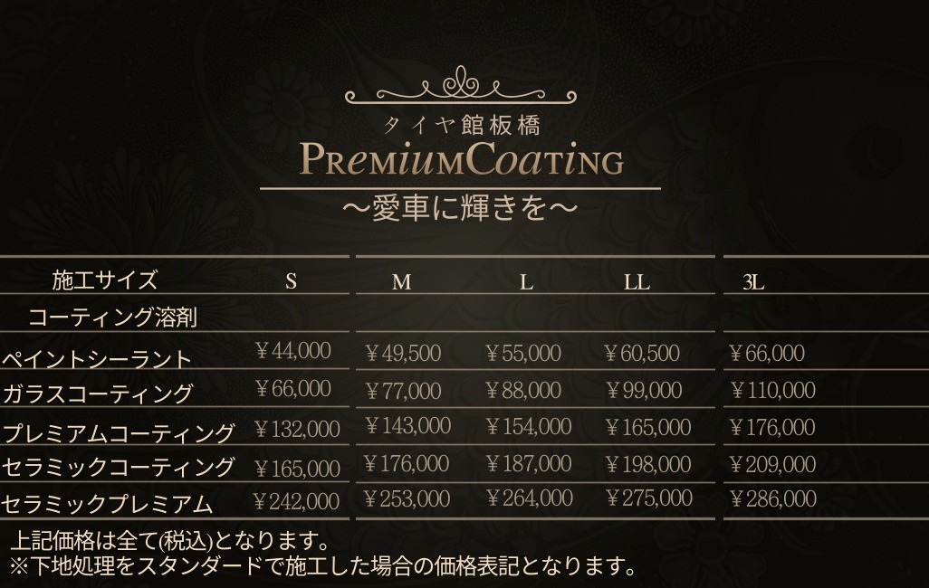 おクルマのサイズや下地処理内容、コーティング溶剤などで価格は変動いたします。