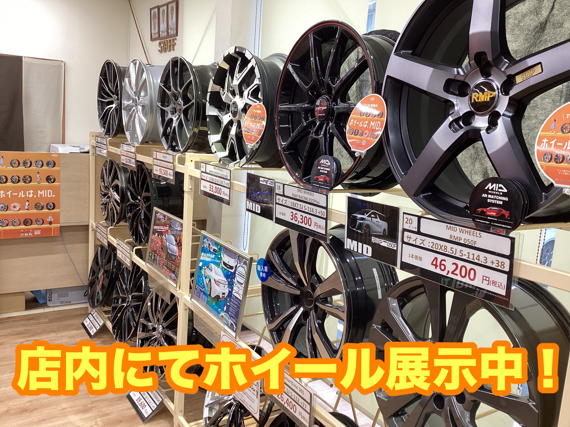 WORKホイールやwedsホイール、MID(マルカ)ホイールを店頭で展示中!