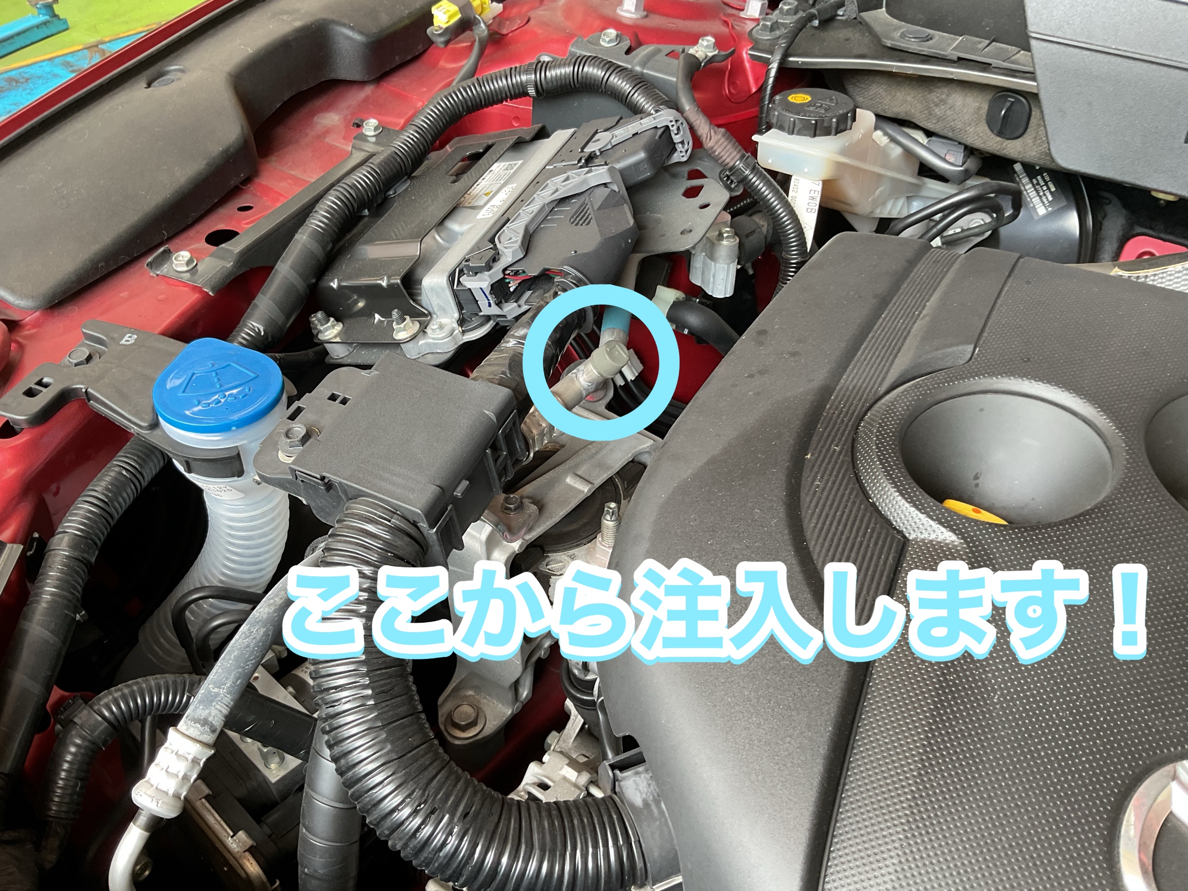 車両のエアコンシステムのバルブに専用の機材で添加剤を注入します。