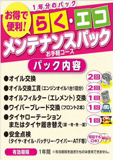 『メンテナンスパック』とはオイル交換2回分とオイルエレメント交換1回、ワイパーフロント2本、ローテーションまたは脱着センターフィット1回分のチケットがあるとてもお買得なモノとなってます!!
