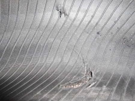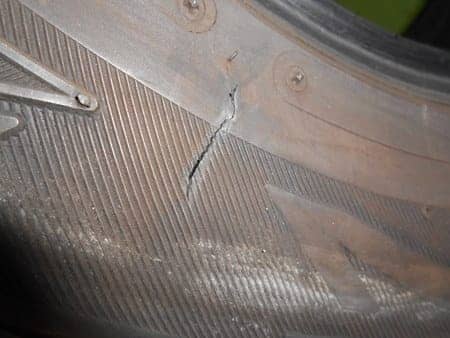 金属片をどうやら踏んでしまい、タイヤの横が裂けておりました。また、パンクに気づかずそのまま走行してしまい、修理できない状態に。。