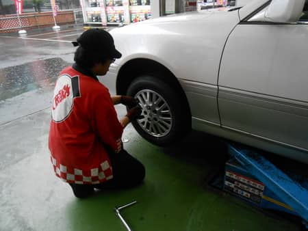 タイヤ館では、こんな大雨の日でもしっかり点検・問診しています!