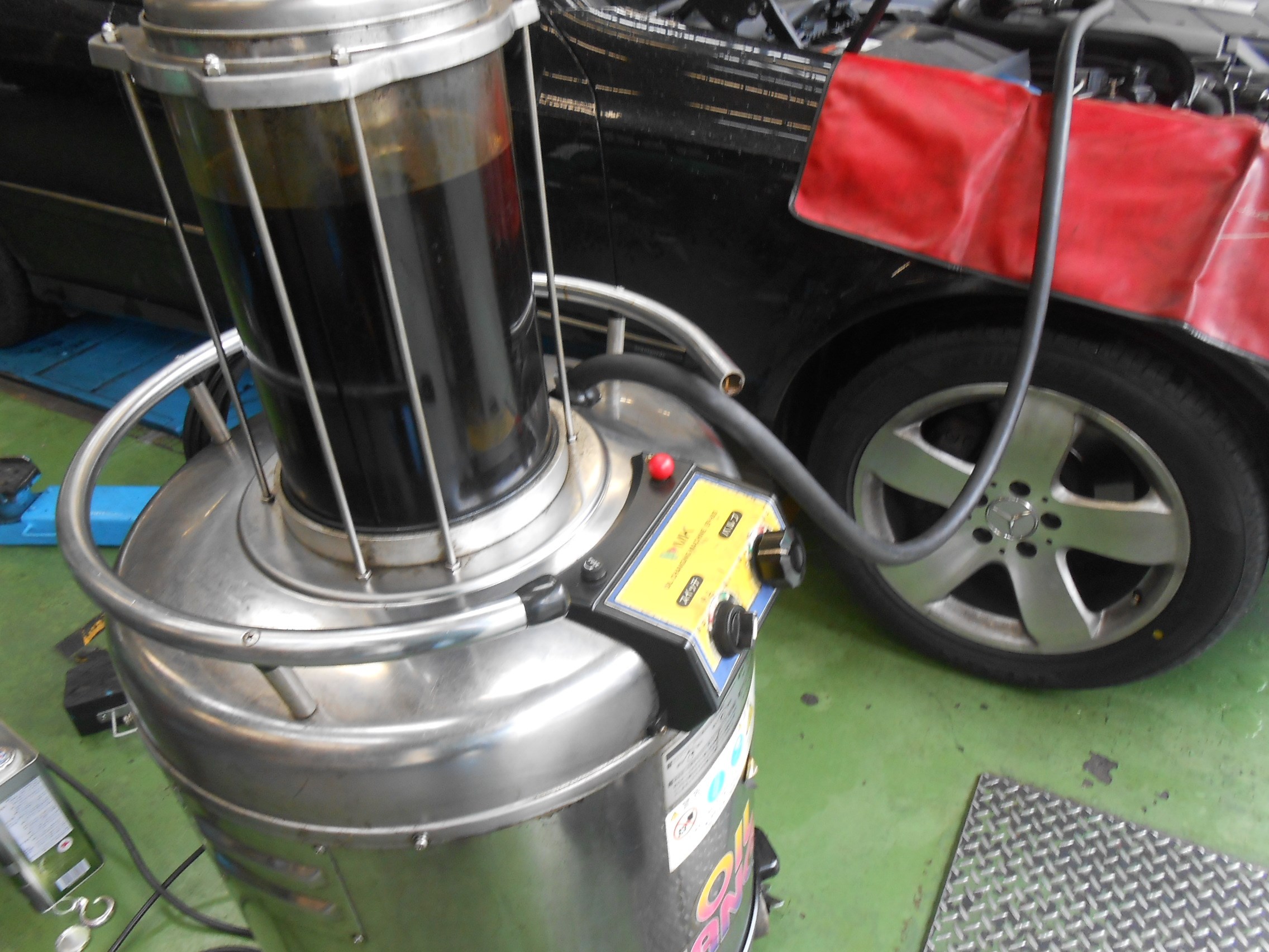 当店では、一部対応出来ない輸入車も御座いますが、基本的に「上抜オイルチェンジャー」を使用し、安全かつスピーディーに作業を行っております。