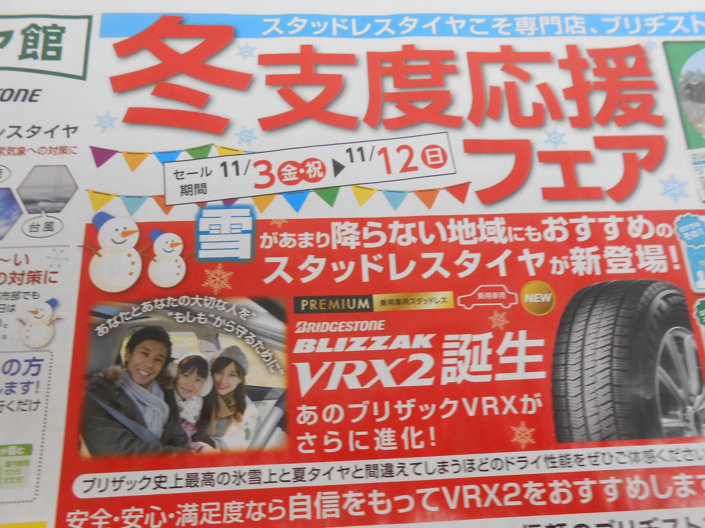 冬支度応援フェア開催中です♪ ポスト 2017年11月10日 11月12日まで冬支度応援フェア開催中です♪ まだスタッドレスタイヤへの履き換え早くない???と思っている方・・・ 全然早くないですよ!! 11月後半~12月になると待ち時間がかかりすぎて、予約無しで来店してしまうと・・・ 履き換え作業が1日掛かりになってしまうなんて事もあります。 今年新品タイヤ購入検討中の方にとっても早くないです!! 新品のスタッドレスタイヤ購入後、降雪エリアに行く前の準備として、乾燥路面での慣らし運転を推奨しているからです!!
