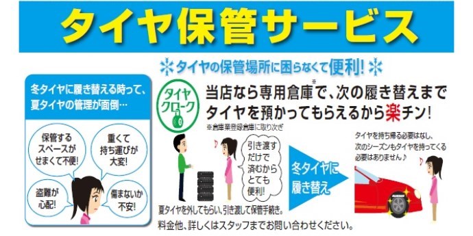 タイヤ保管サービスでわざわざタイヤを車に積まなくても、ラクラク交換出来ます!!