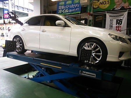 マークXで一週間程前にタイヤ交換後の作業をしたお客様がアライメントで