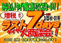何の事かって? 消費税増税です。 たかが3%かもしれないけど我が家には大打撃です\(゜ロ\)(/ロ゜)/ 自分は買い溜めとかは好きではないですが必要な物は買って備えようかとは思っています。 当店にも連日、3月中にタイヤ交換はしておこうかなというお客様にご来店いただいています。 安い買い...