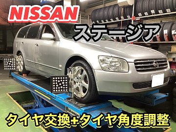 こんにちは、タイヤ館板橋です❗️ 今回は板橋区板橋からお越しのお客様の 【日産 ステージア】のタイヤ交換+タイヤ角度調整をしました! 10年前のタイヤで経年劣化によるヒビ割れが地面との接地部分に出ていた為 交換させていただきました! 今回交換した Playz PX-RVⅡ は ミニバン専用タイヤで 従...