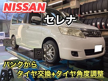 【日産 セレナ】経年劣化によるヒビ割れ‼️ タイヤ交換+タイヤ角度調整❗️