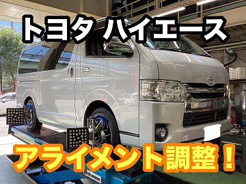 トヨタ ハイエース(200系)入庫です! 今回はこちらのお車のアライメント作業をご紹介いたします! こちらのハイエースは、フロントタイヤの外減りが激しく、交換時期が早まってしまっていました。 すでにタイヤは新品に交換されたとのことだったので、アライメントを測定から開始! ハイエースは...