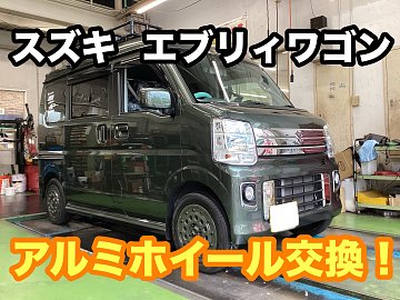 スズキ エブリイワゴン入庫です! 今回はこちらのお車のホイール交換をご紹介いたします! 今年に入ってから新車で購入されたそうで、ご来店いただいたときはスズキ純正ホイールが装着されていました。 もともとシルバーのホイールでしたが、オフロード感・キャンピング感を演出したいというご希望...