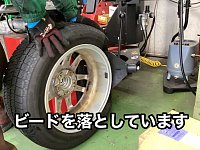 作業紹介①の続きです!! まずはタイヤのビードを落としていきます。 この時に重要なのが、ホイールのディスク面の反対側から落とすこと! こうすると、ディスク面にキズが入りにくいんです! 裏をすべて落としたら、表もしっかり落とします。 ビードを落としたらチェンジャーにチャッキング! 写真...
