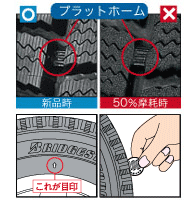 ただし、これは簡易的な確認手法なので、詳しくはお近くのタイヤ販売店等にご相談ください。