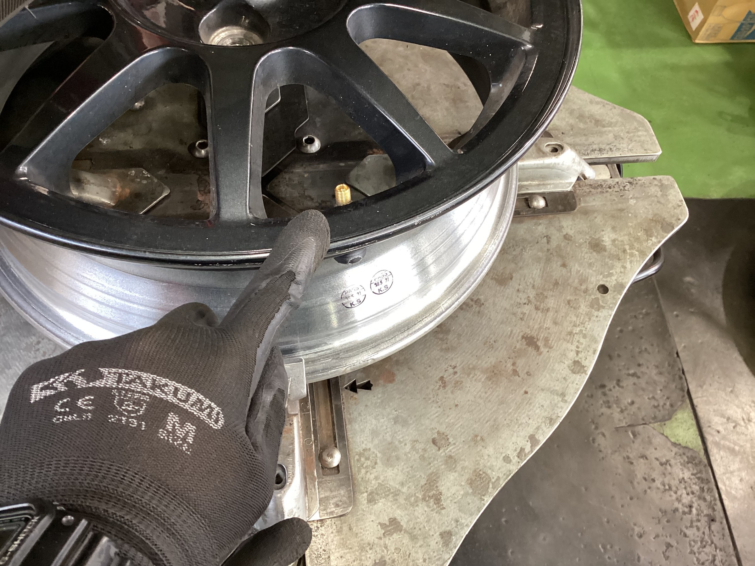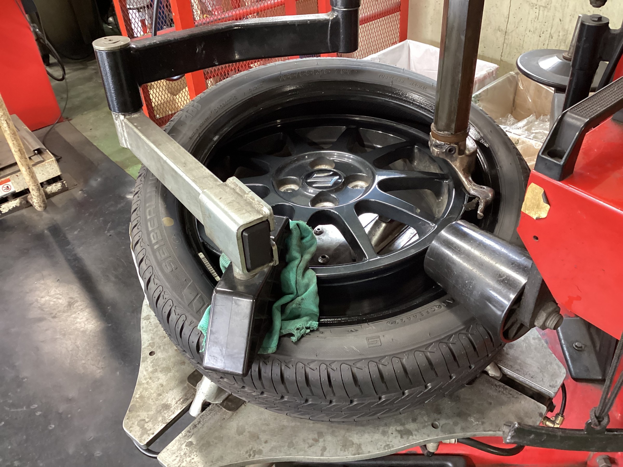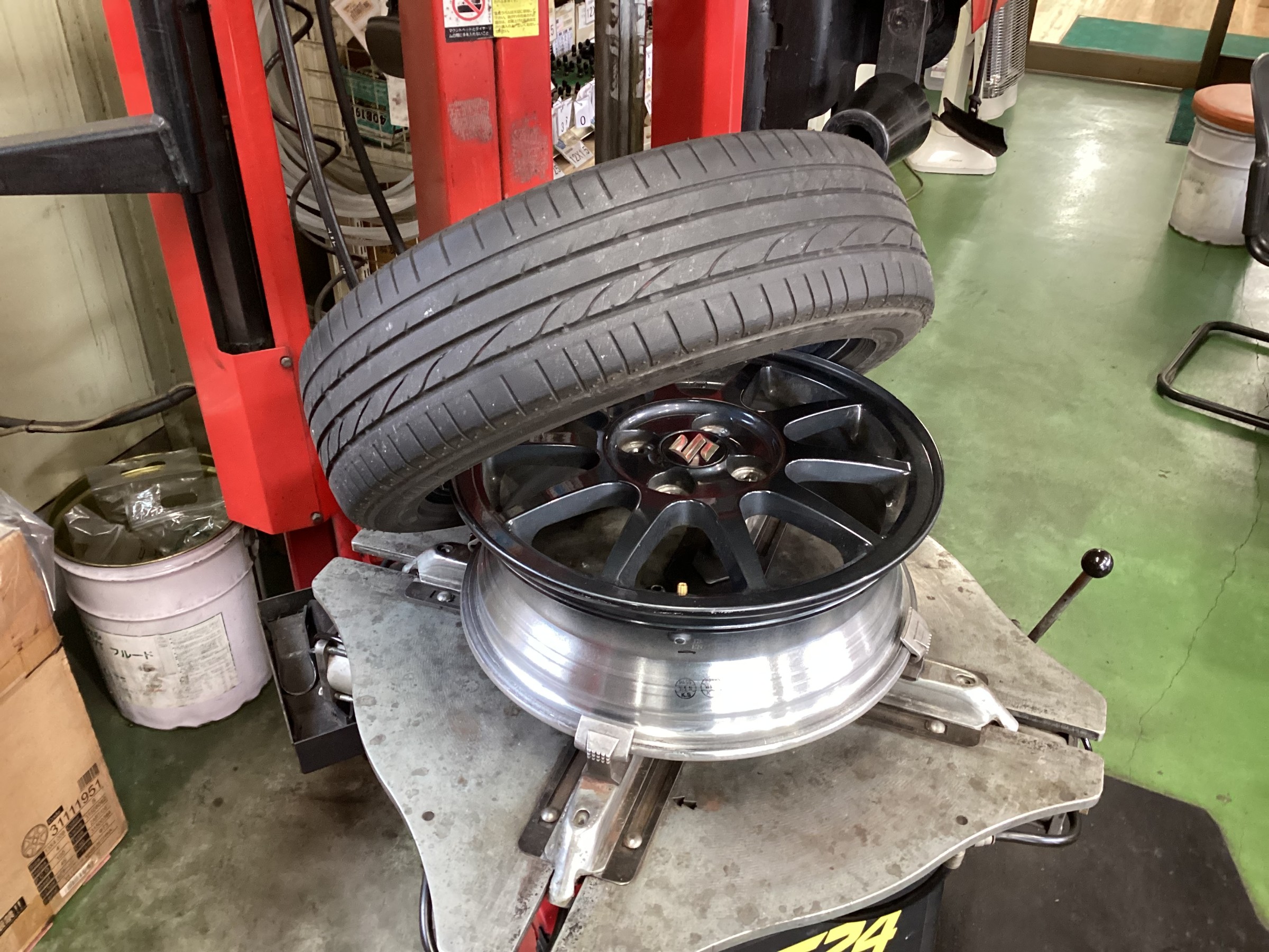 偏平タイヤなのでタイヤチェンジャーのヘルパーを使用し組み付けますが、