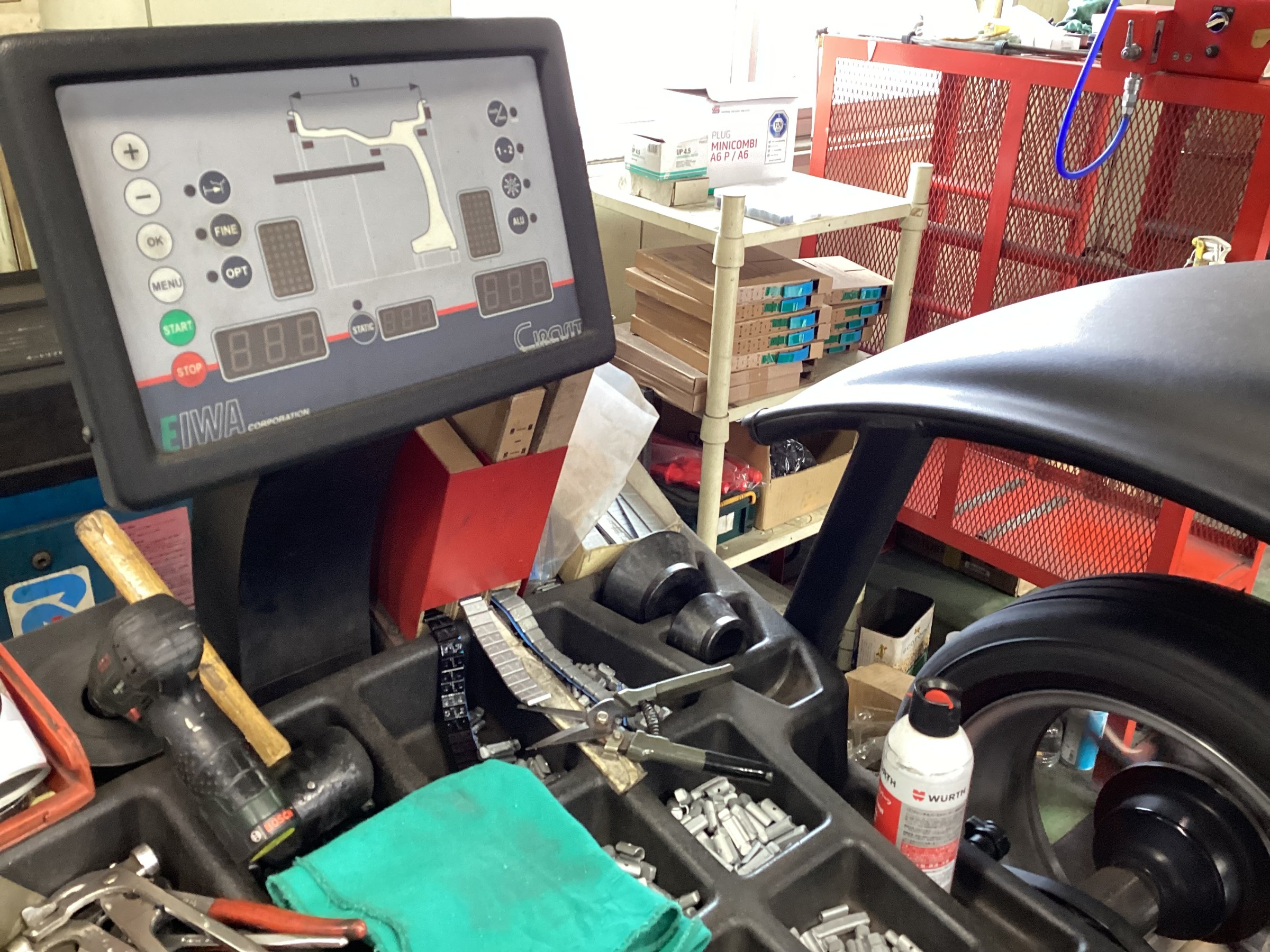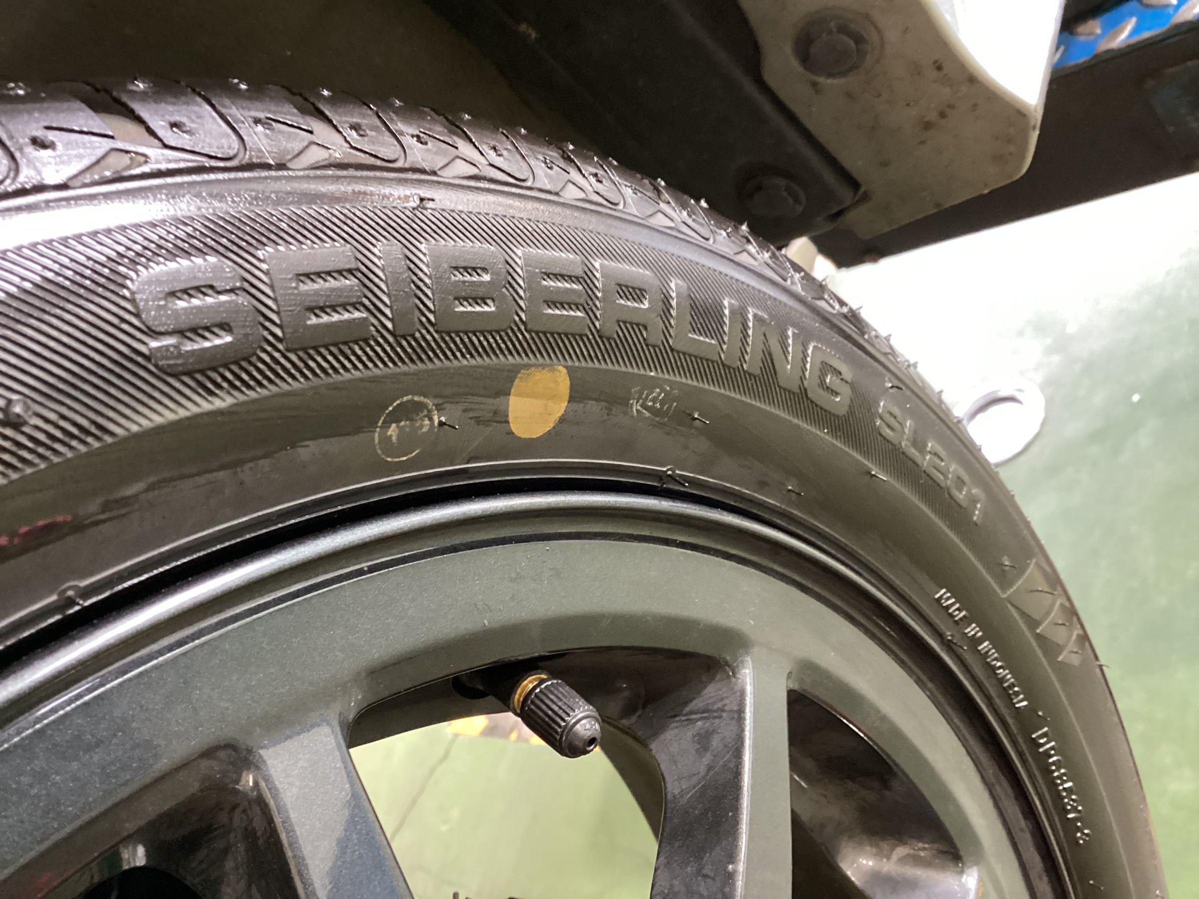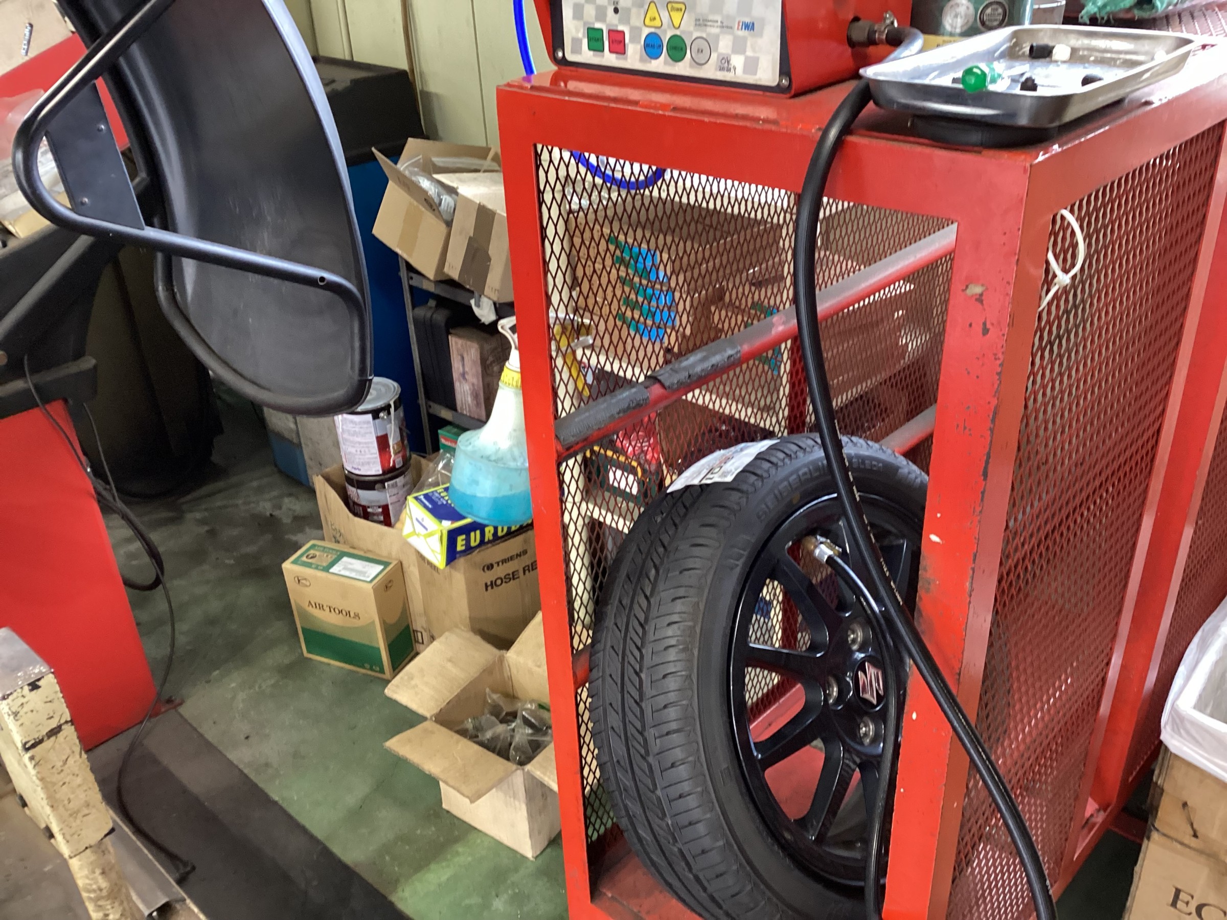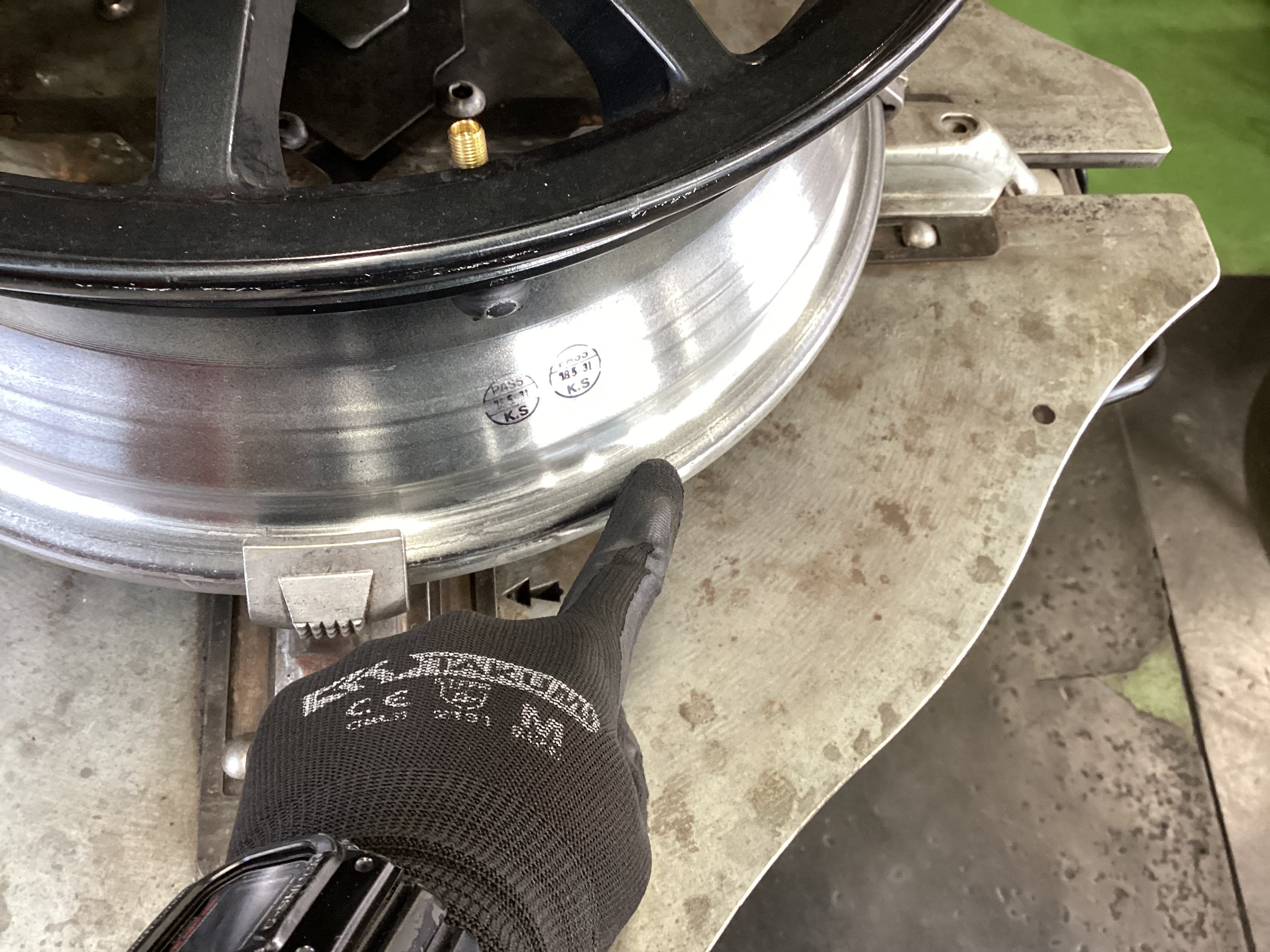 偏平タイヤなのでタイヤチェンジャーのヘルパーを使用し組み付けますが、