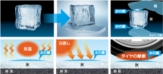 路面の氷も同じように、「気温」「日差し」「タイヤの摩擦」などで次第に融けて、表面にうっすらと水の膜が生じます。