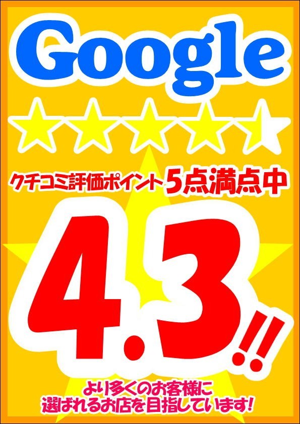 当店ではグーグルでの口コミ評価4.3を頂いております。