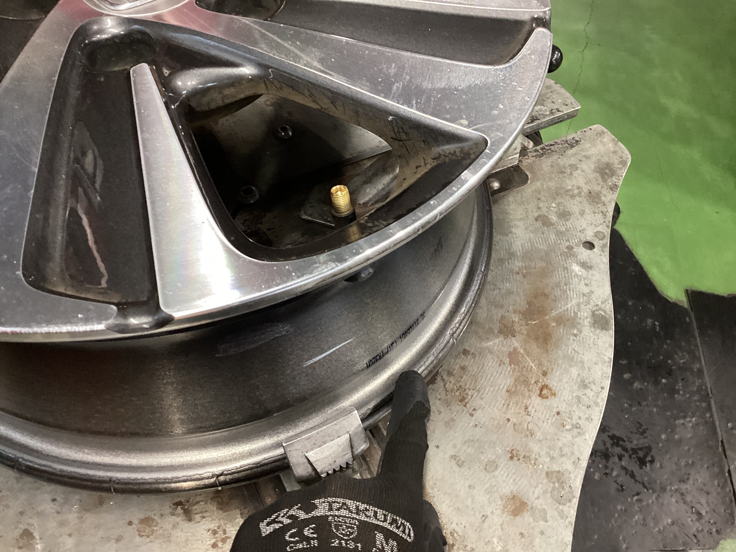 このカスが付着したままタイヤを組み付けますとエア漏れの原因となりますので、