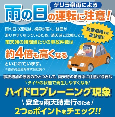 とくに雨の日の高速道路等では、溝が浅くなっているとタイヤと路面の間の水をかき出す力(排水性能)が低くなり、タイヤが路面から浮く状態になることで、ハンドルやブレーキが利かなくなる「ハイドロプレーニング現象」が発生しやすくなります。