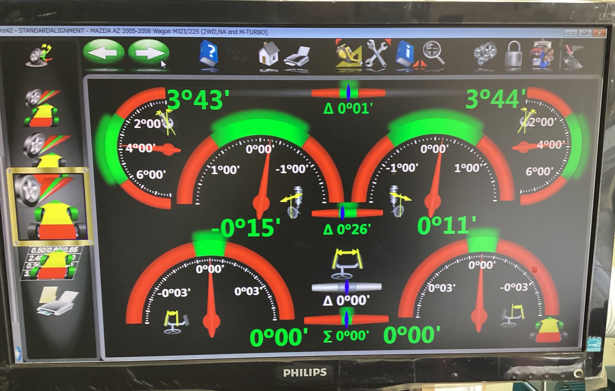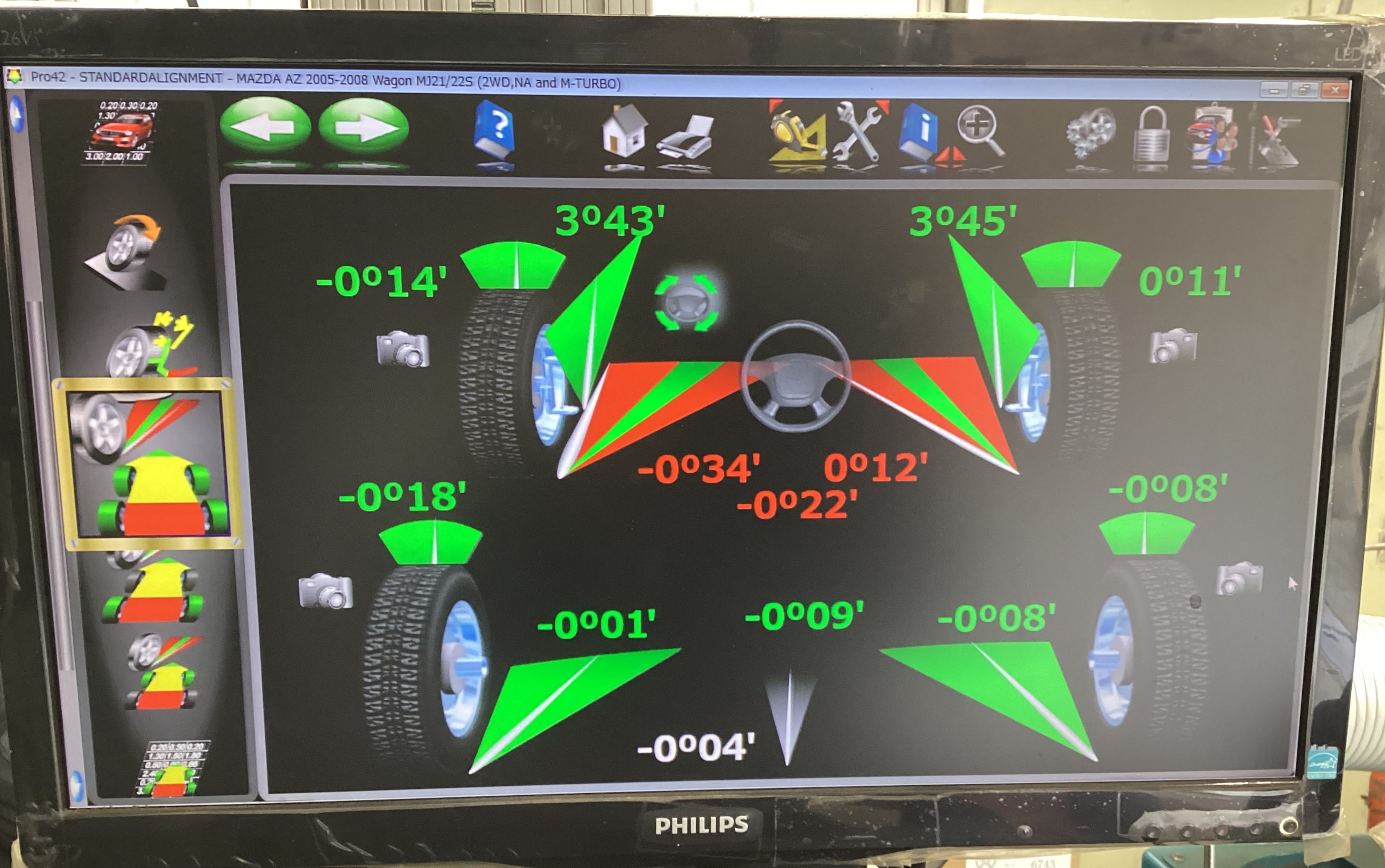 そんな代車のAZワゴンですが、ハンドルのセンターが気になったので、アライメント測定をしてみました。