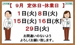 ☆☆☆9月15(火)・16日(水)は定休日です♪☆☆ ポスト 2020年9月14日 いつもタイヤ館 岩出店のHPをご覧頂き、 ありがとうございます(#^.^#) 定休日のご案内です!! 今回は変則的ですが、 明日明後日、9月15日(火)と16日(水)は定休日となっております。 ご来店の際にはお気を付けください。 またのご来店をスタッフ一同、心よりお待ちしております(^o^)丿 担当:酒谷 知宏