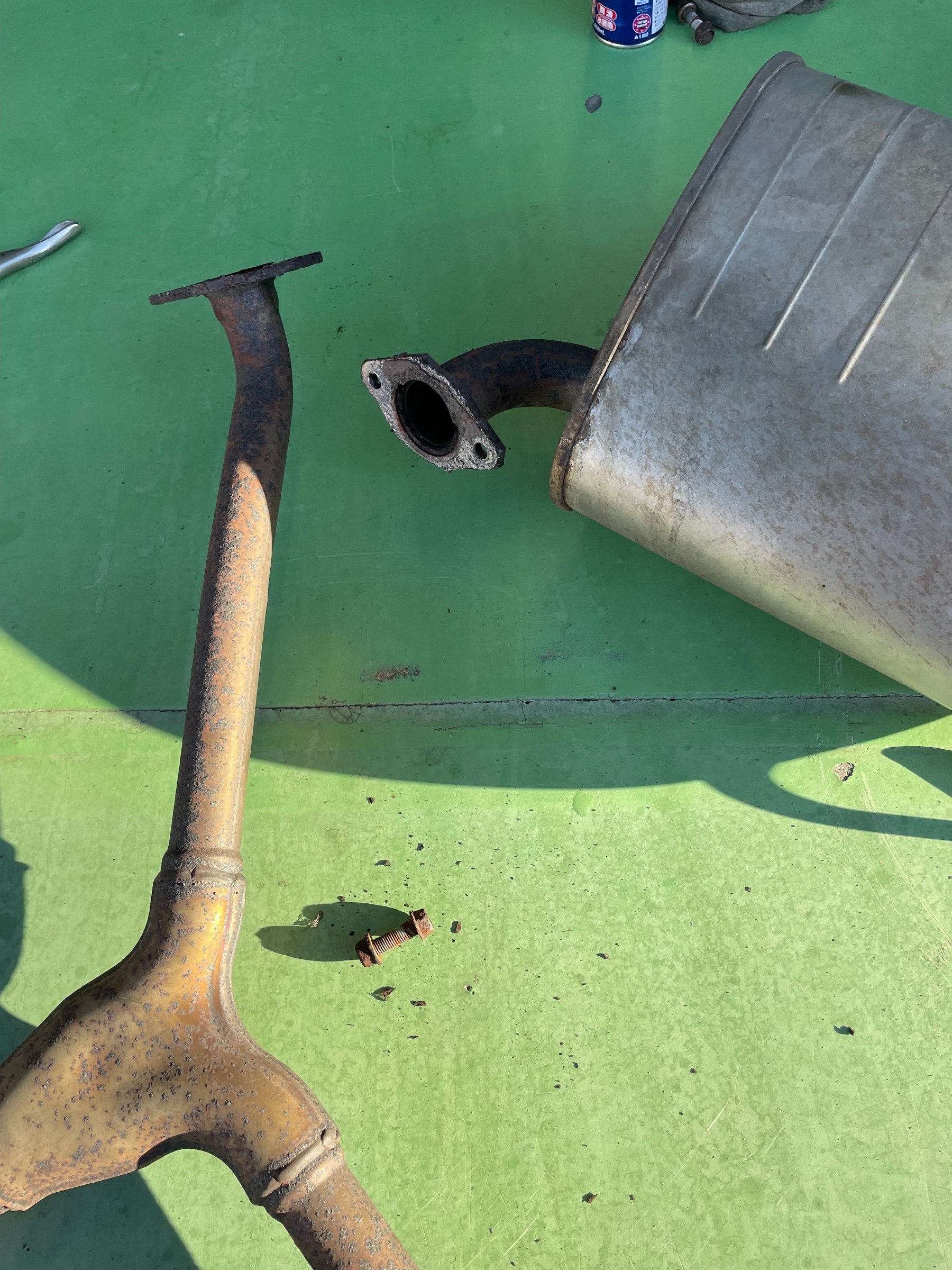 ↑センターパイプ、マフラー、ボルトの錆の進行がすすんでおり、