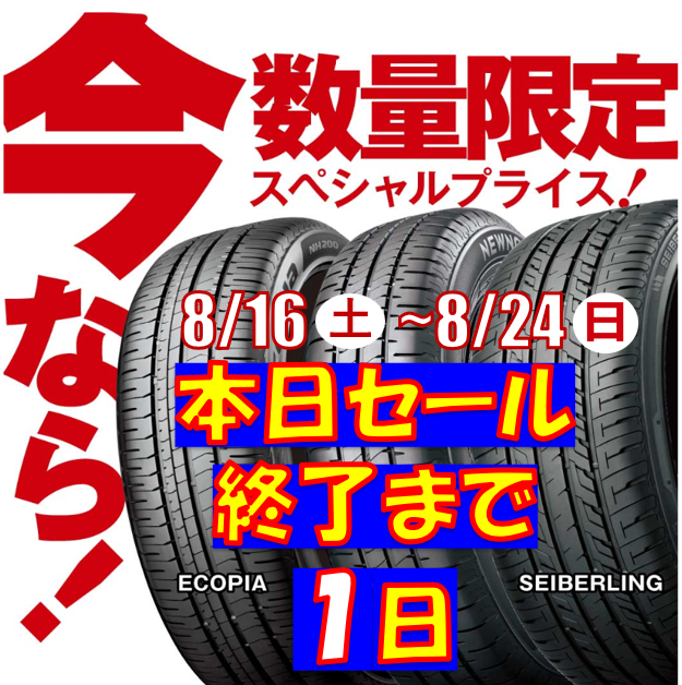 タイヤスペシャルプライスデーは、8/16(土)~8/24(日)まで。