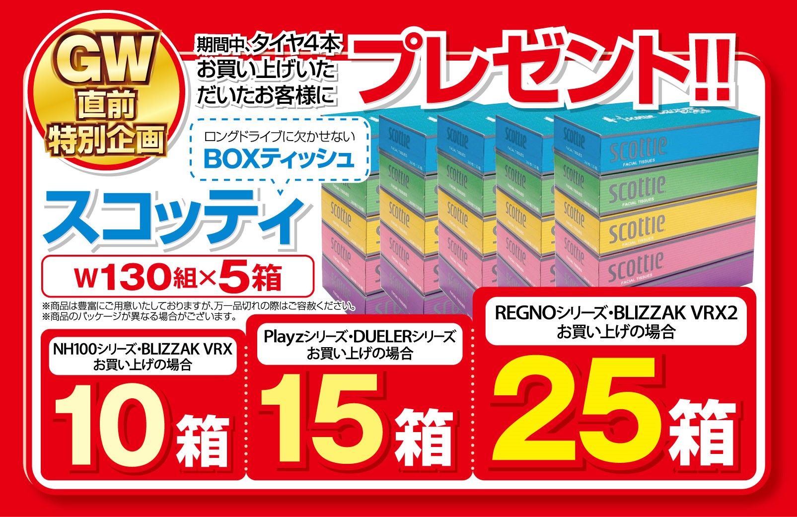 プレゼント中です。なんと・・・タイヤの商品によりティッシュの箱が増えます。
