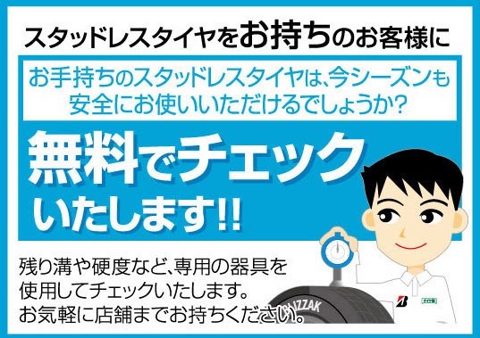 お手持ちのスタッドレス1本持ってきて頂ければ事前に点検できますよ♪