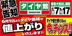 当店WEBをご覧いただきありがとうございます。 すでに一部報道などでお聞き及びかと存じますが 6月1日よりタイヤ価格が値上がりいたします。 そのため【タイヤ館岩出】では緊急大売出し期間と致しまして 本日から4月17日(月)まで 緊急大売出しセールを開催致しております。 タイヤ交換するなら今...