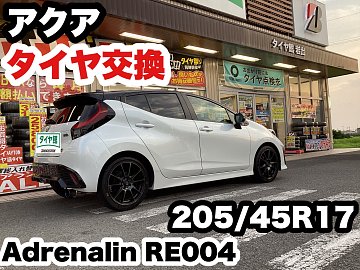いつもタイヤ館岩出のホームページをご覧頂きありがとうございます! アクアのタイヤ交換のご紹介です☆ タイヤ:POTENZA Adrenalin RE004 サイズ:205/45R17 GRなので、少し珍しいタイヤサイズです! アクアのタイヤサイズといえば、185/65R15や175/65R15等のサイズが多いですね♪ なので、常時在庫...