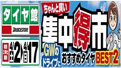 ホームページをご覧いただきありがとうございます。 只今、開催中のセール・・「集中得市」も4月17日(日曜日)まで!! ゴールデンウィークも目前!! お出掛け前に・・・ タイヤのことはもちろん・お車のメンテナンス品もタイヤ館にお任せ下さい(^^) 是非ご来店下さい(^^)