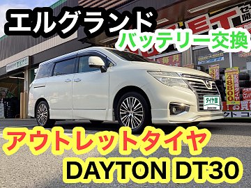 いつもタイヤ館岩出のホームページをご覧頂きありがとうございます! エルグランドのタイヤ・バッテリー交換のご紹介です☆ タイヤ:DAYTON DT30(デイトン ディーティーサンマル) サイズ:225/55R18 デイトンタイヤはブリヂストン工場製のタイヤで 現在在庫処分価格で通常よりもさらにオトクになって...