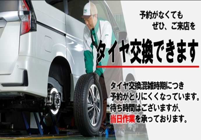 タイヤ館ではご予約無しでも 当日のタイヤ交換・オイル交換・脱着作業を受付しております。 お気軽にご相談ください。 12月は繁忙期に伴い待ち時間が発生するケースもございます。 皆様のご来店心よりお待ちいたしております。