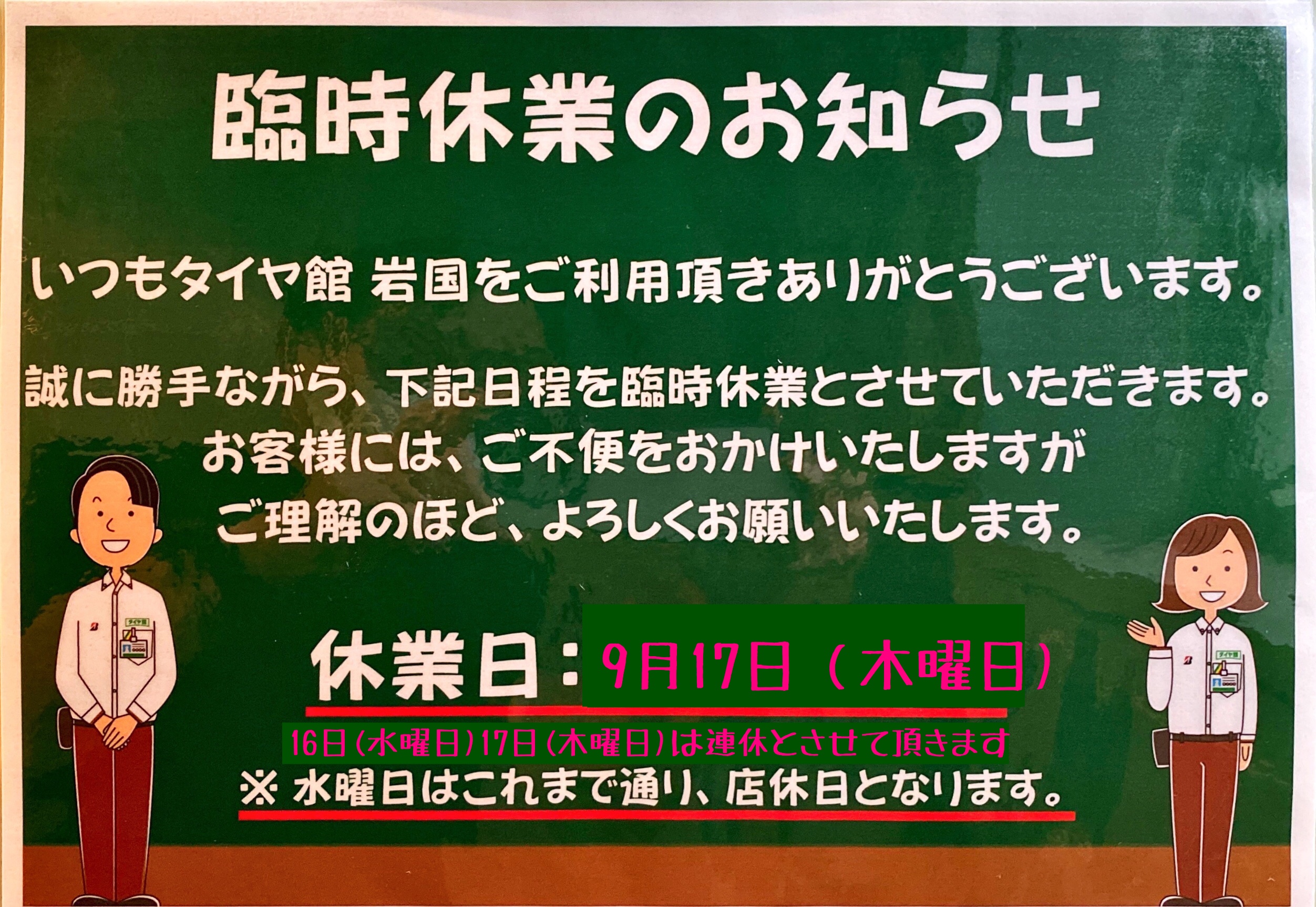 9月17日木曜日は店休日となっておりますのでご迷惑お掛けしますが…よろしくお願いします。