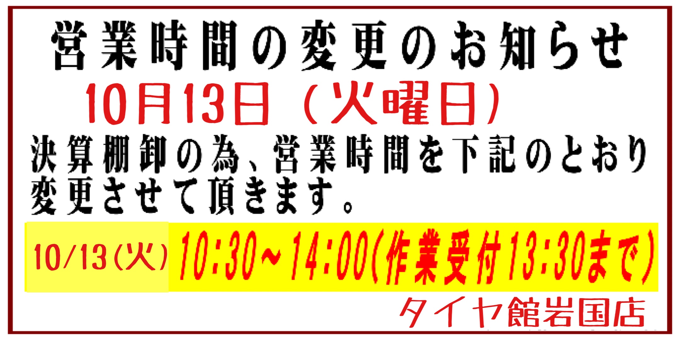 14時閉店(作業受付13時30まで)になります。