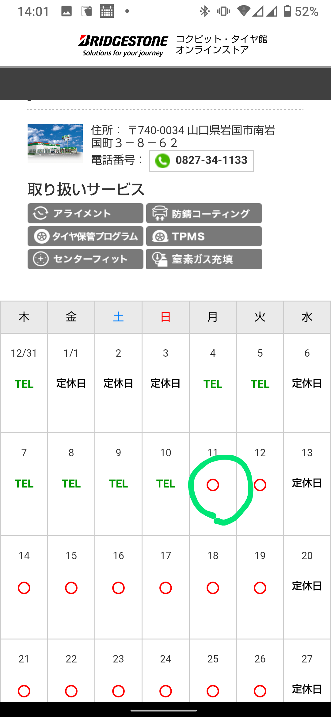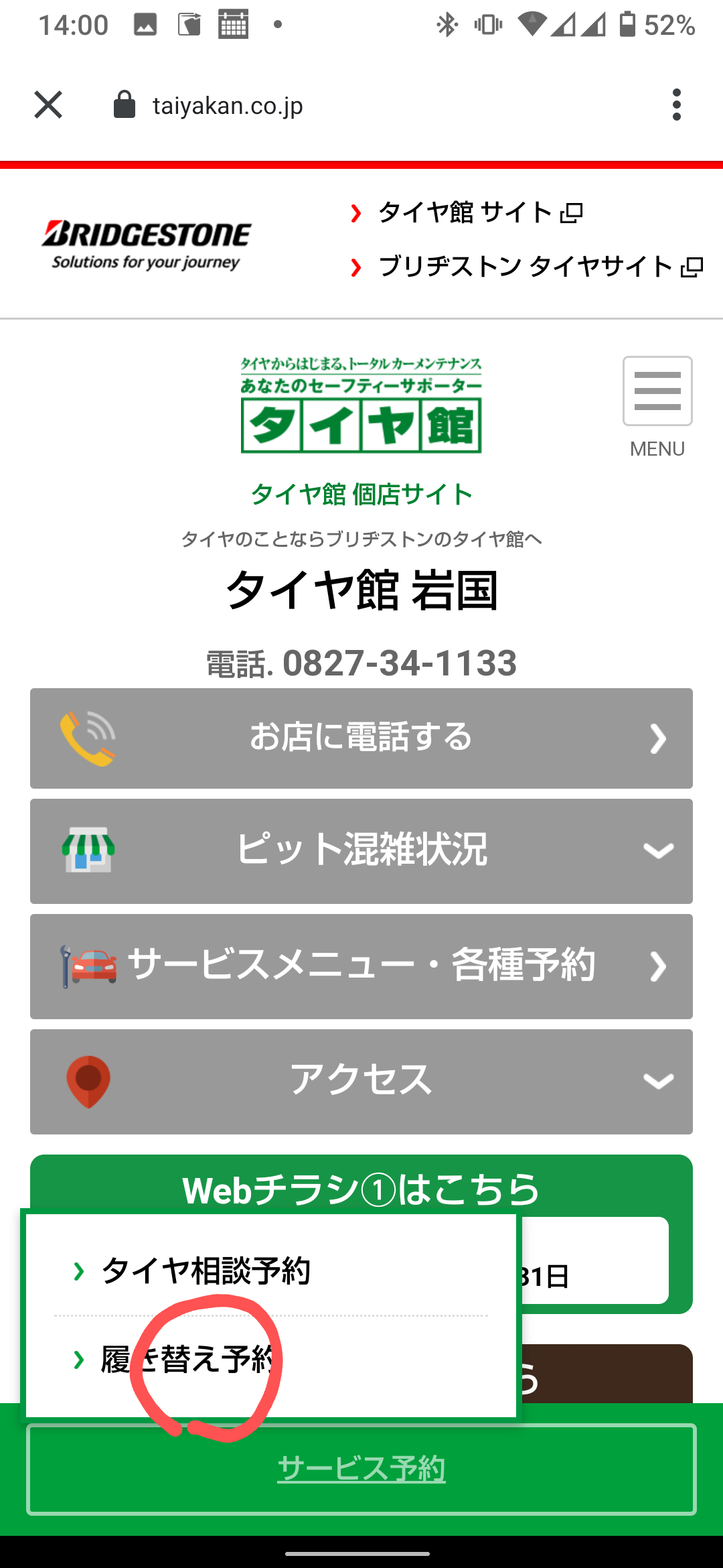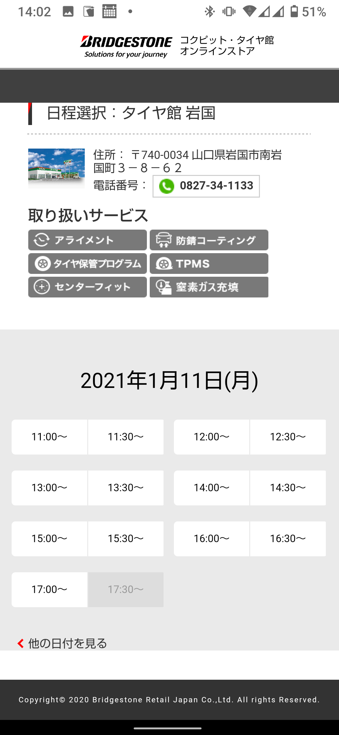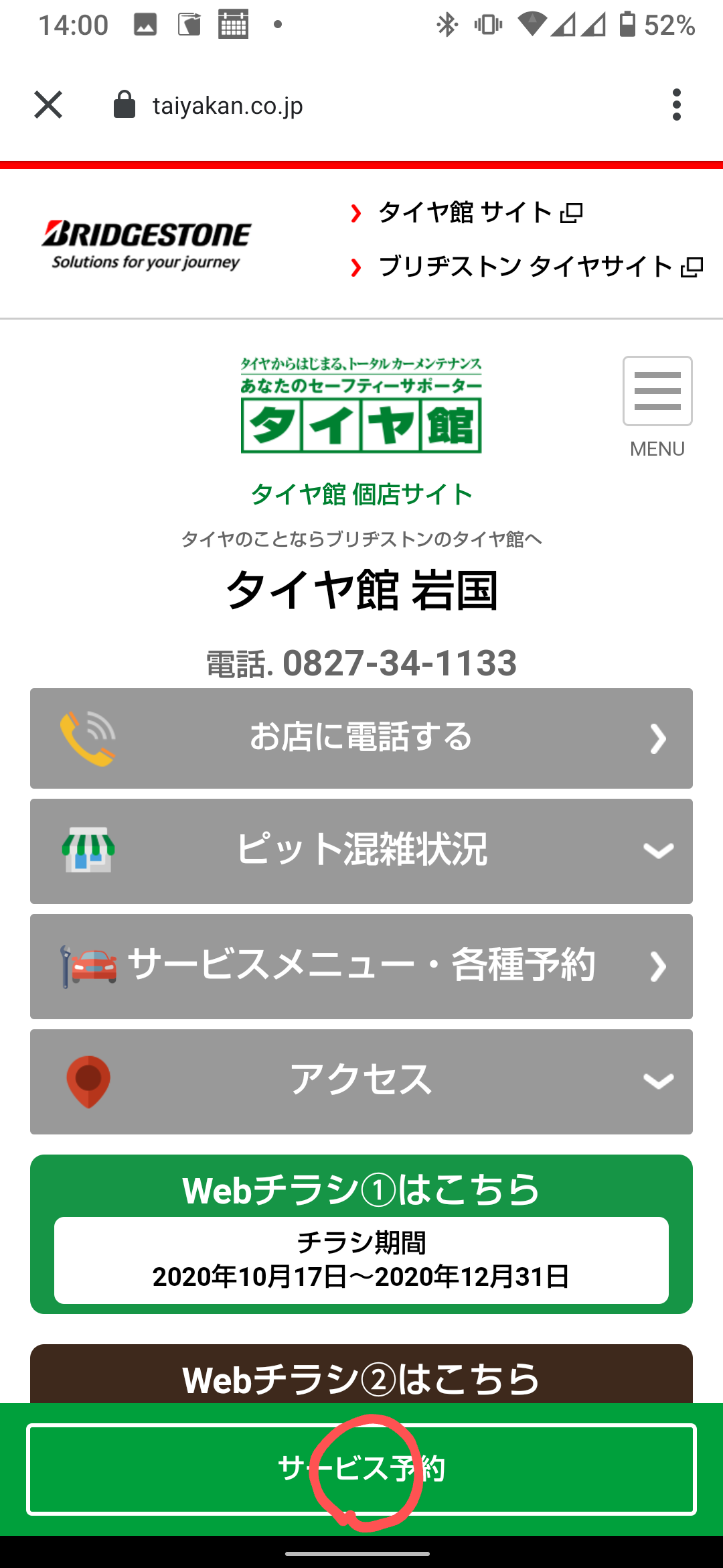 まずはタイヤ館岩国のWebサイトを開きます。