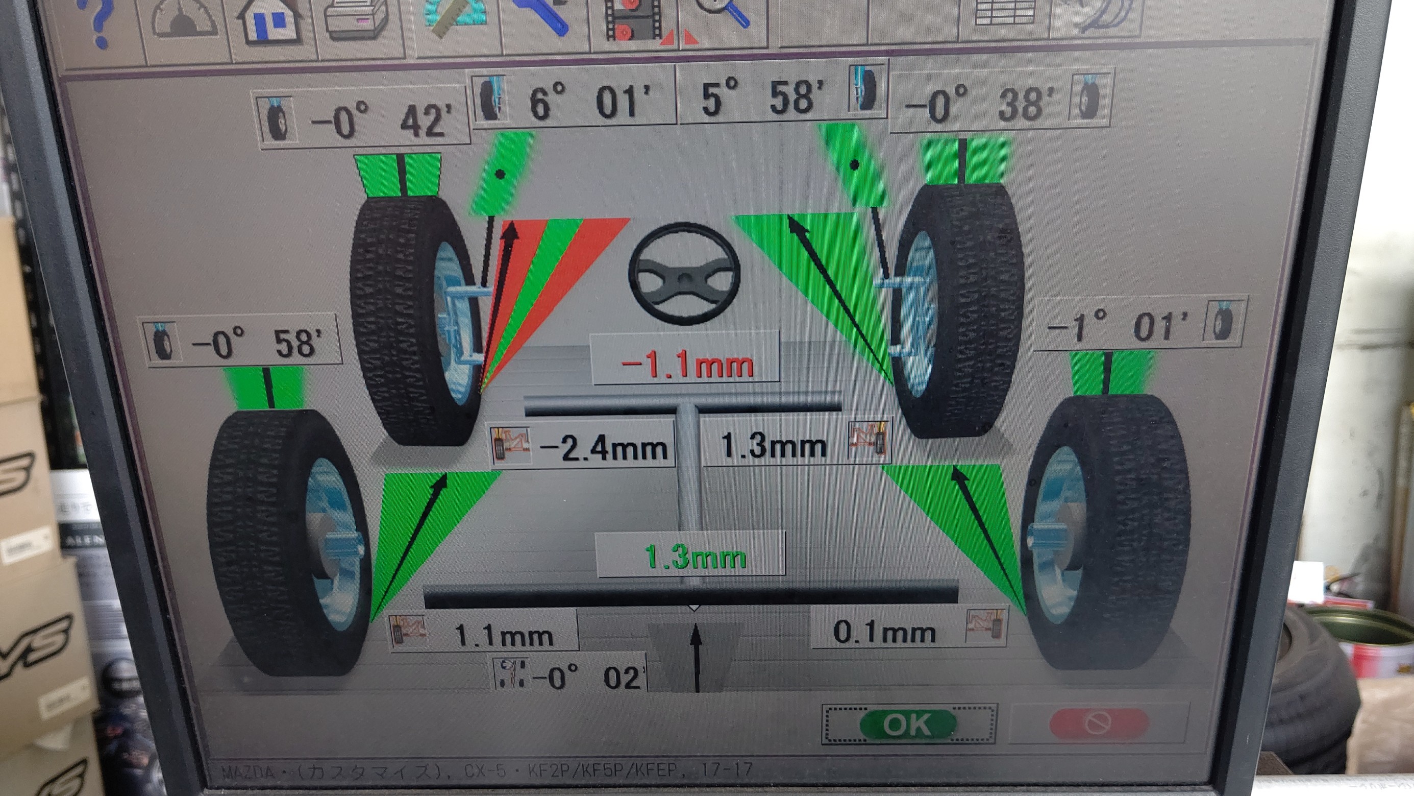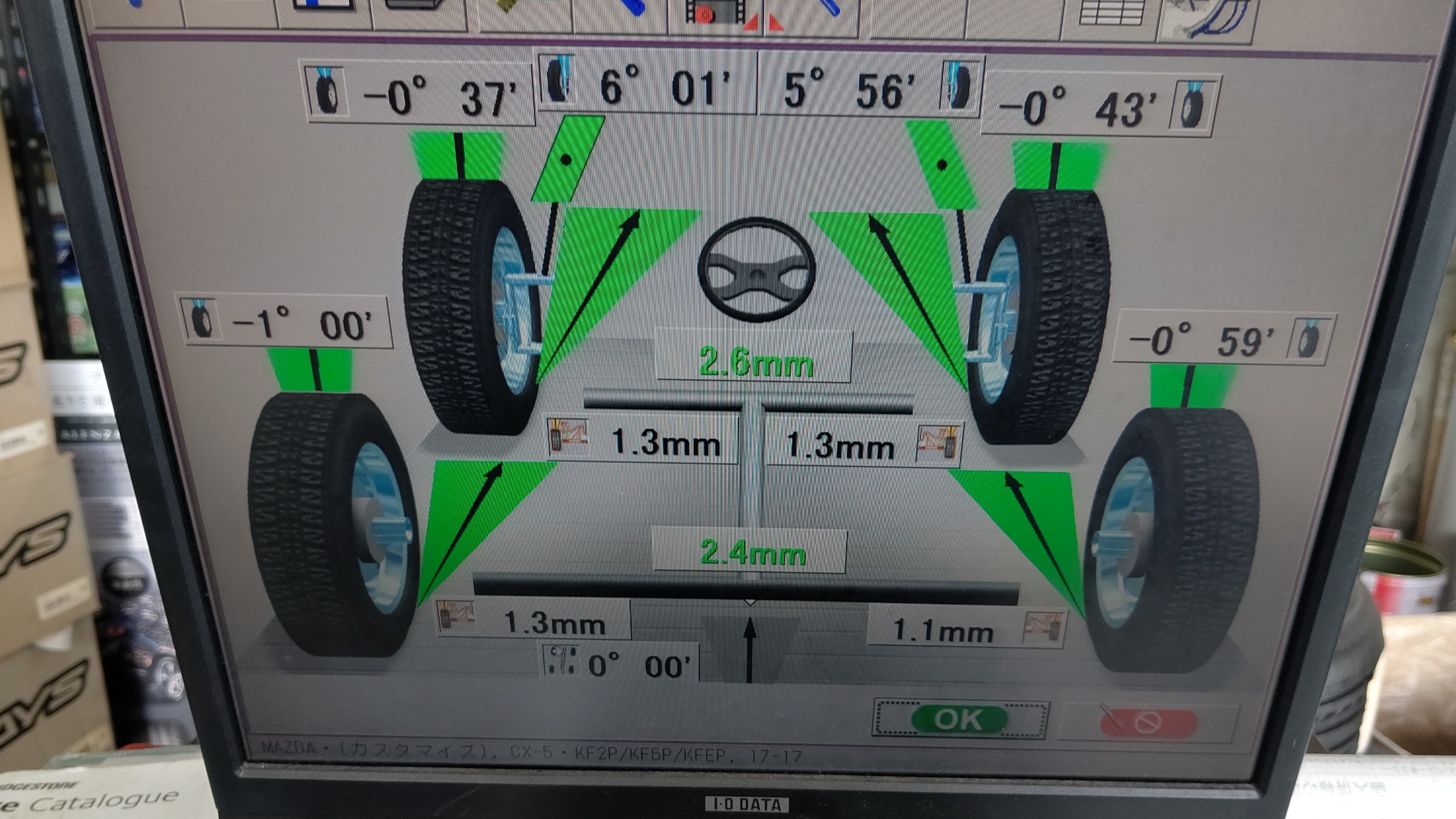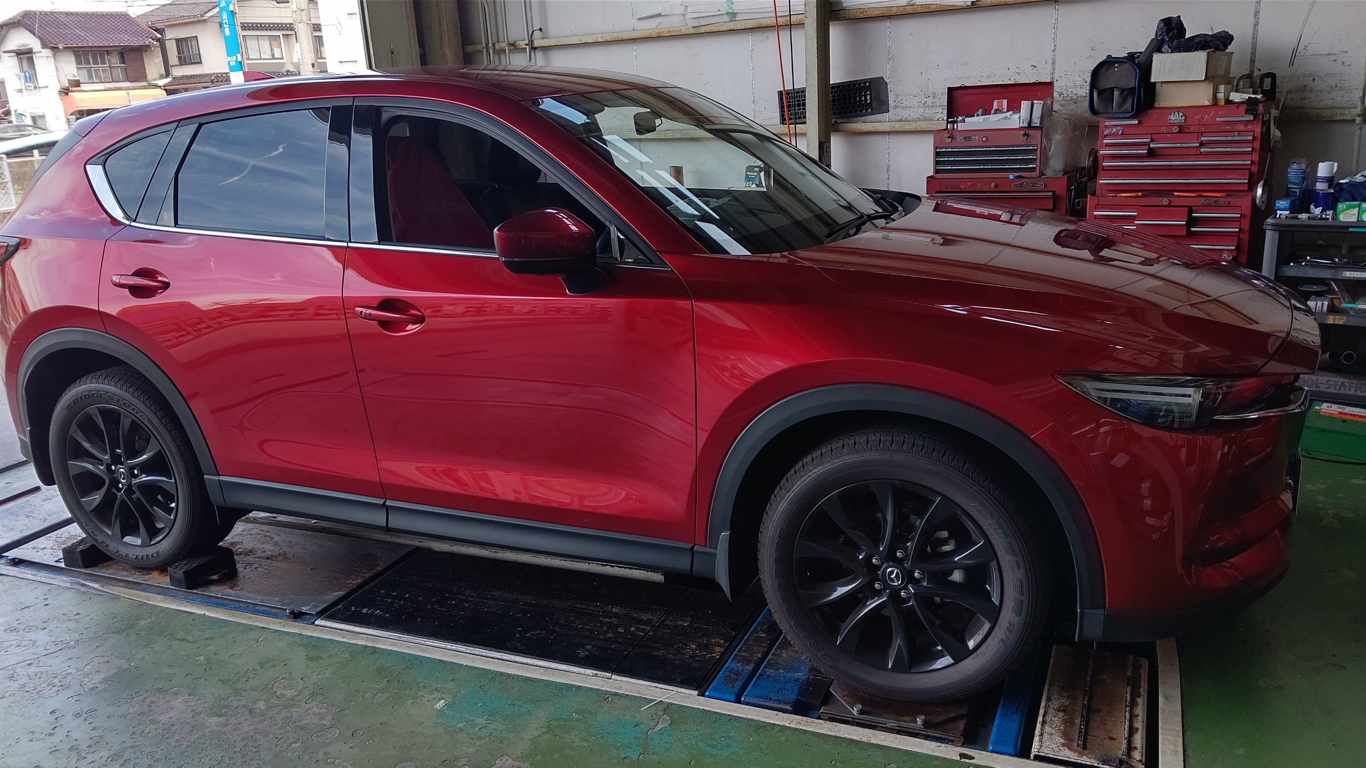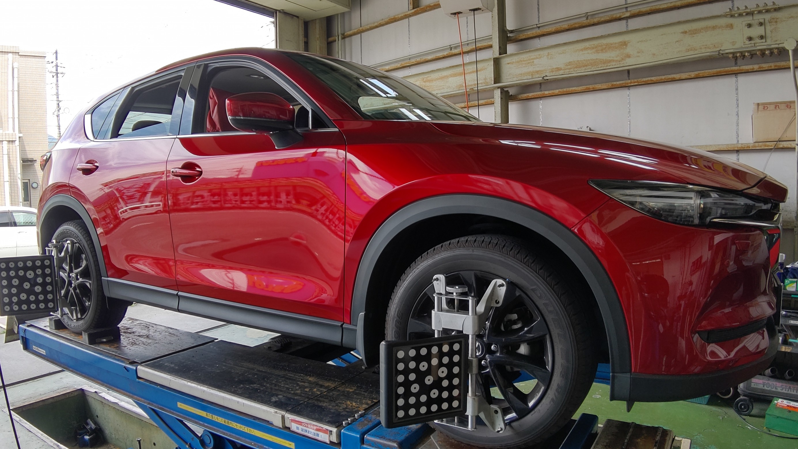 今回はCX-5のお客様が、タイヤとホイールを交換したら真っ直ぐ走らなくなったというのでアライメント調整作業をする事になりました。
