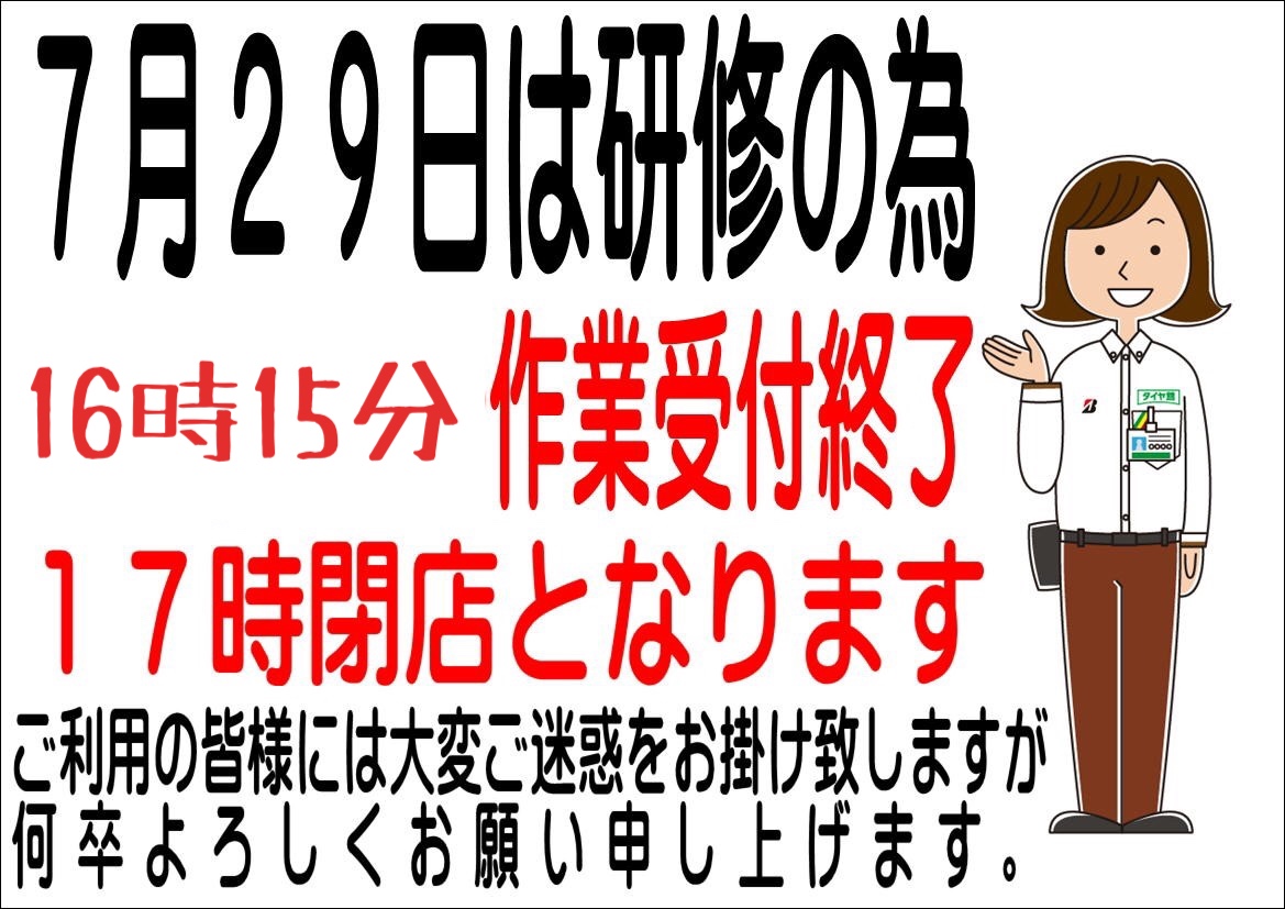 7月29日は、社内研修のため営業時間が以下の通りになります。