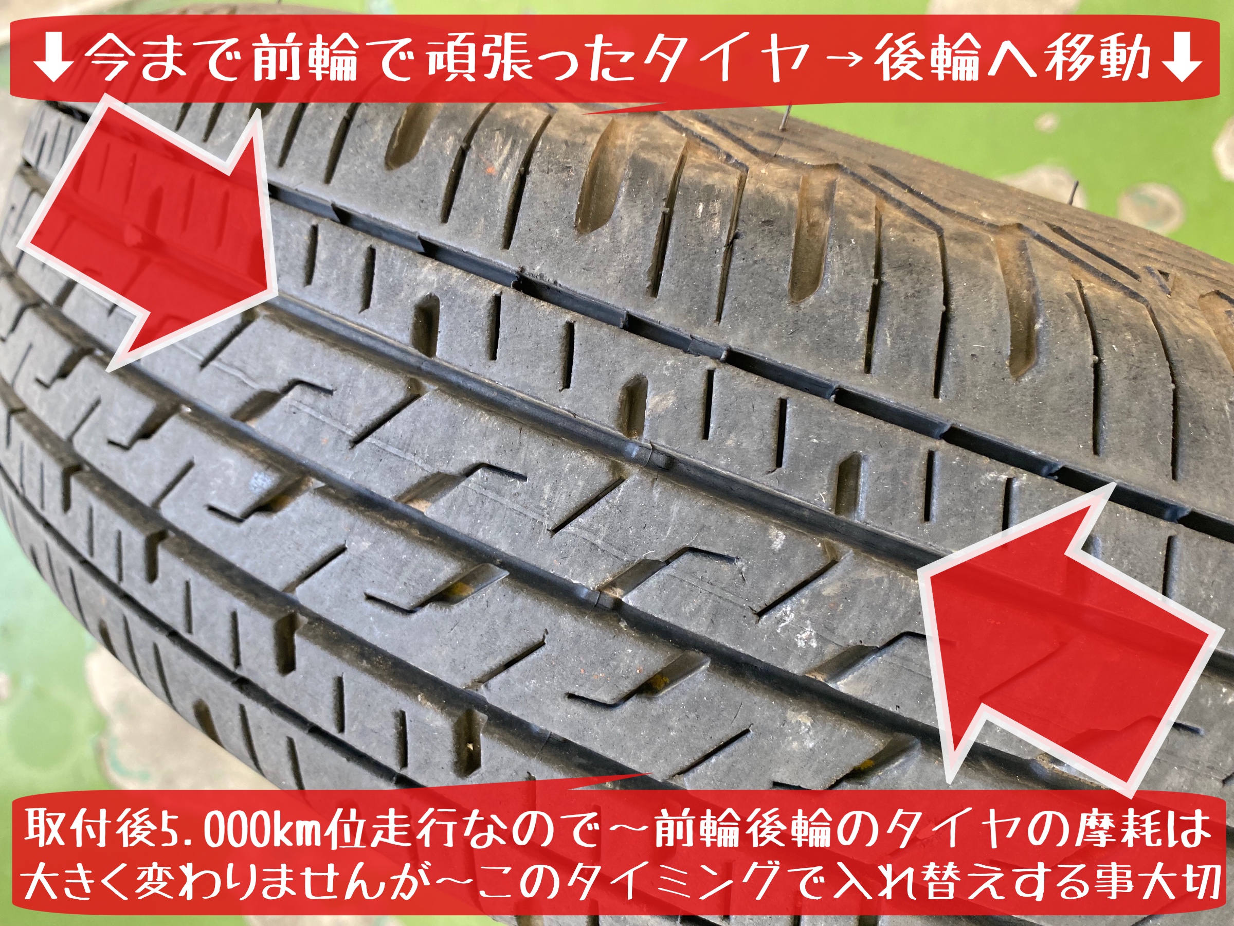 タイヤ館岩国店での〜タイヤの前後入れ替えローテーション作業のおすすめ目安は〜約5.000kmに一度になります。