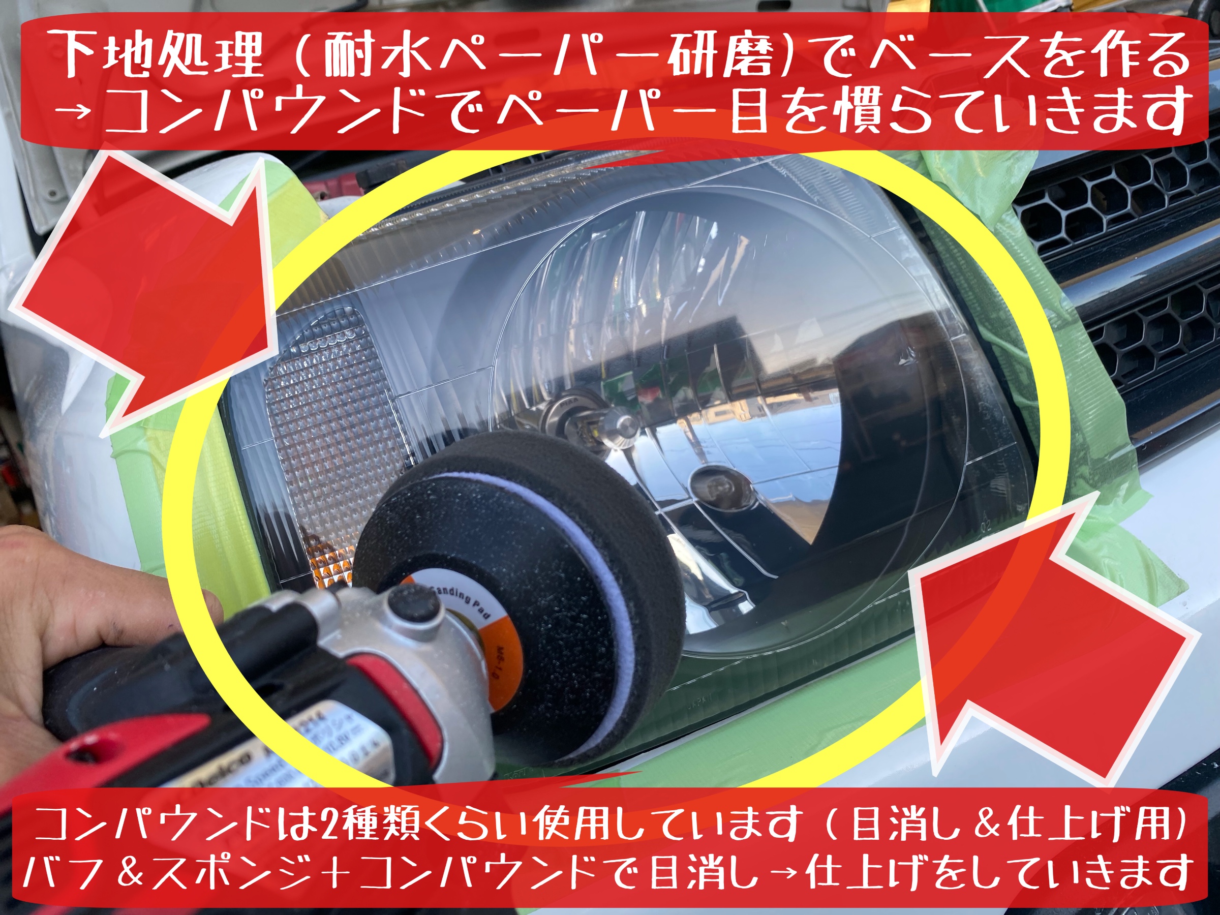 上記①簡易的なヘッドライトクリーンングでは除去出来ない事も多いので〜②ヘッドライト磨き&コーティング施工もおすすめですよ♪
