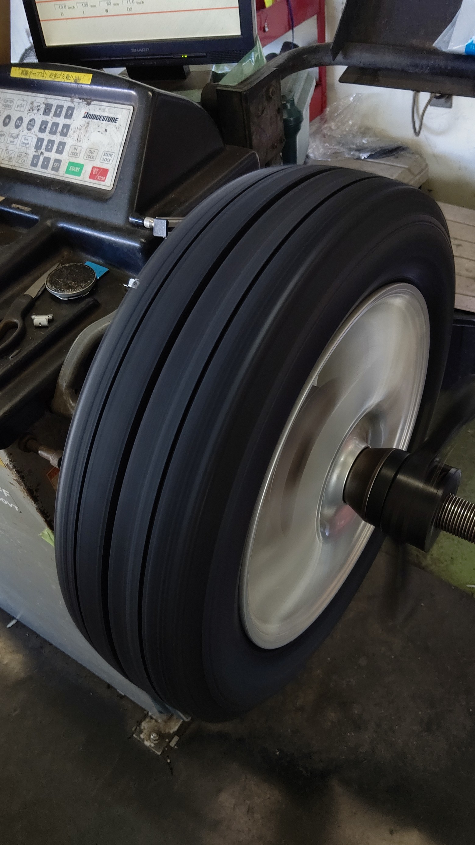 タイヤを組み換えして安全柵に入れて空気圧を充填します。