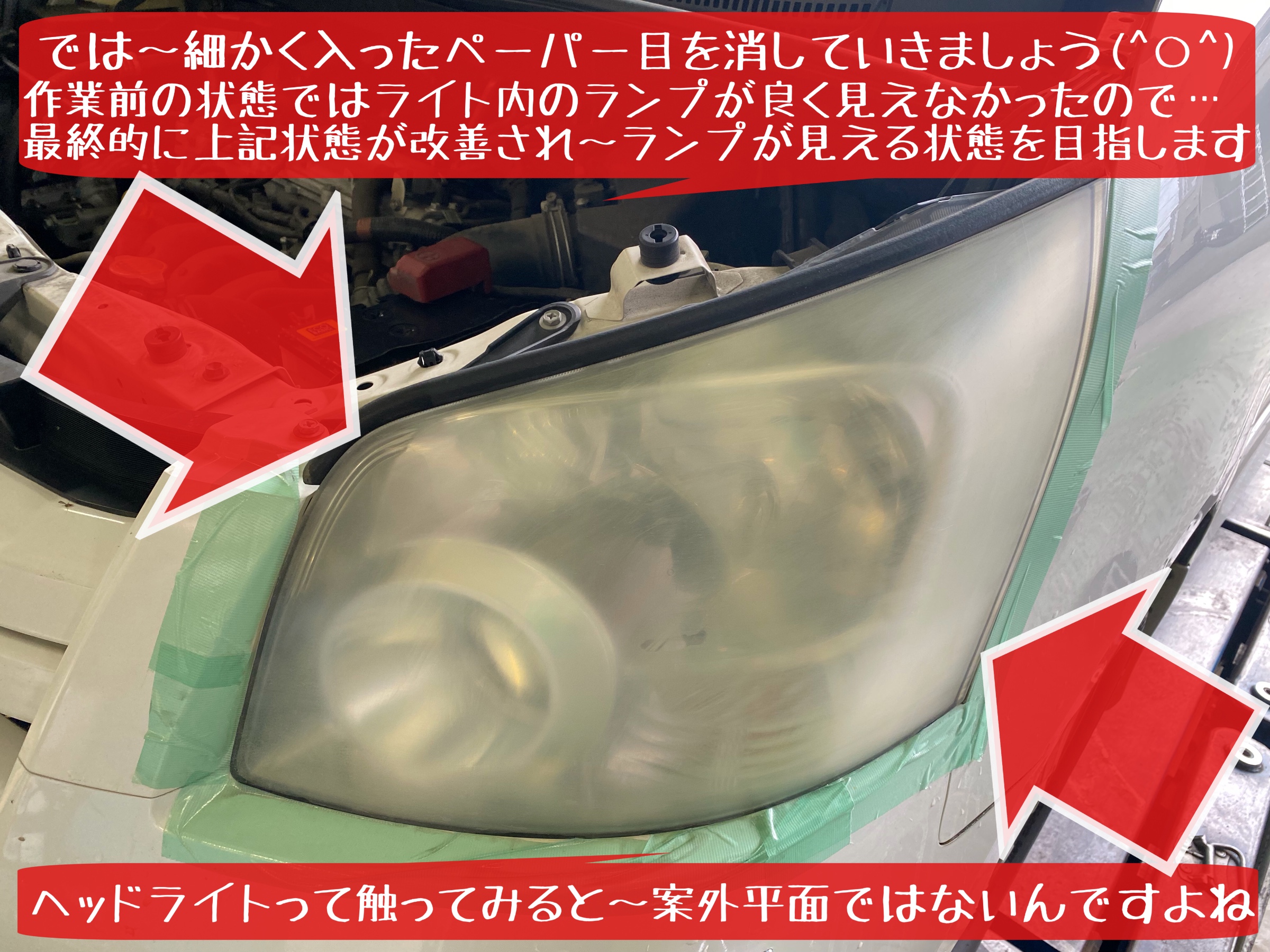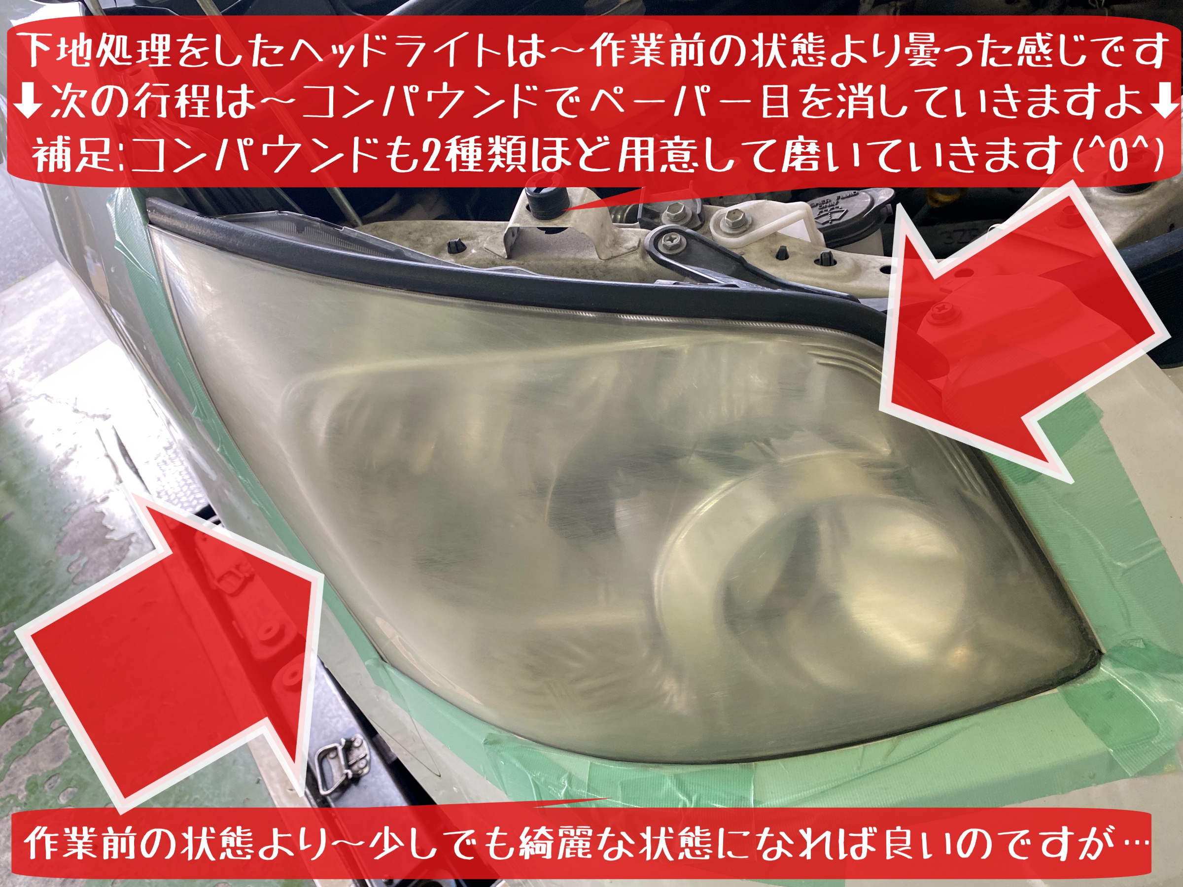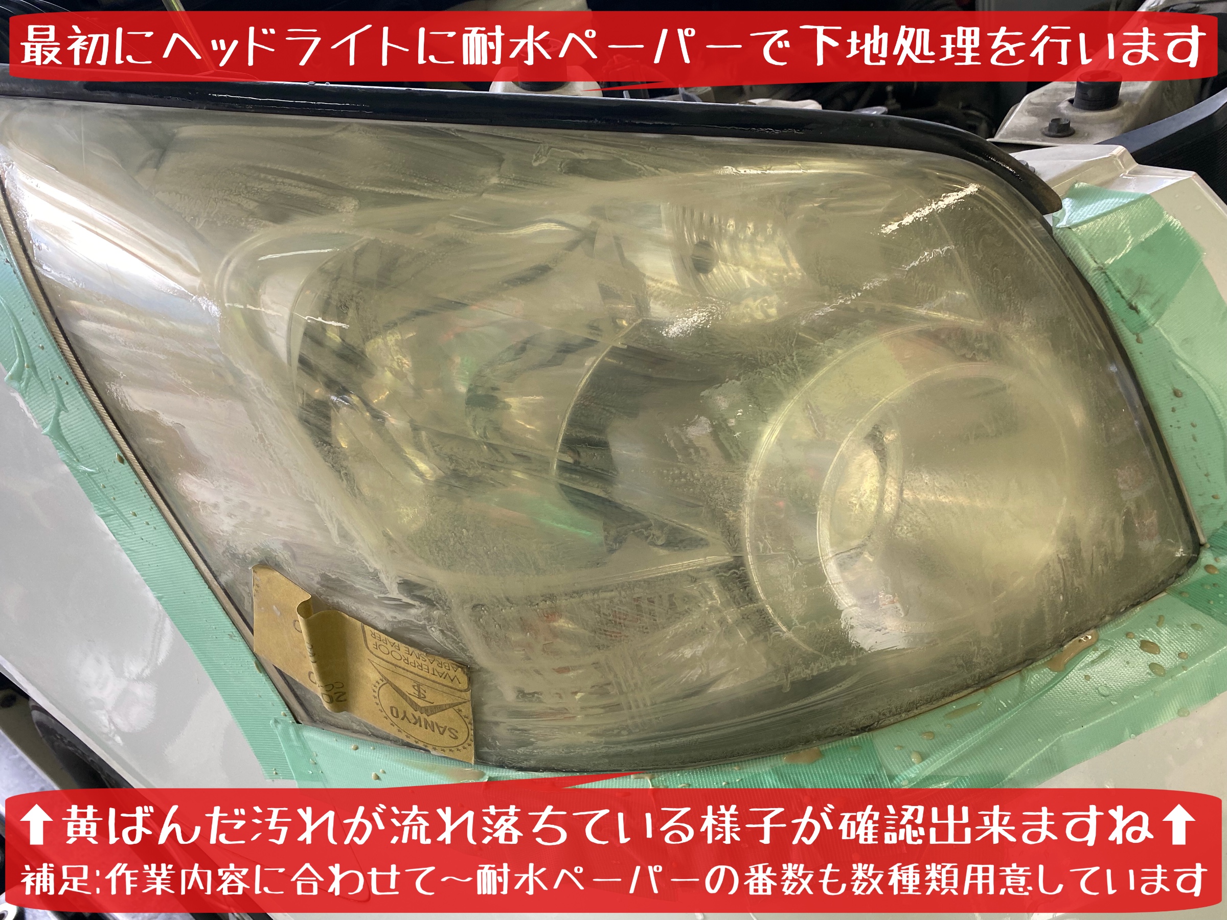 上記耐水ペーパー磨き後の状態から〜どう変化するか?明日はコンパウンド磨き&コーティング施工を紹介します。