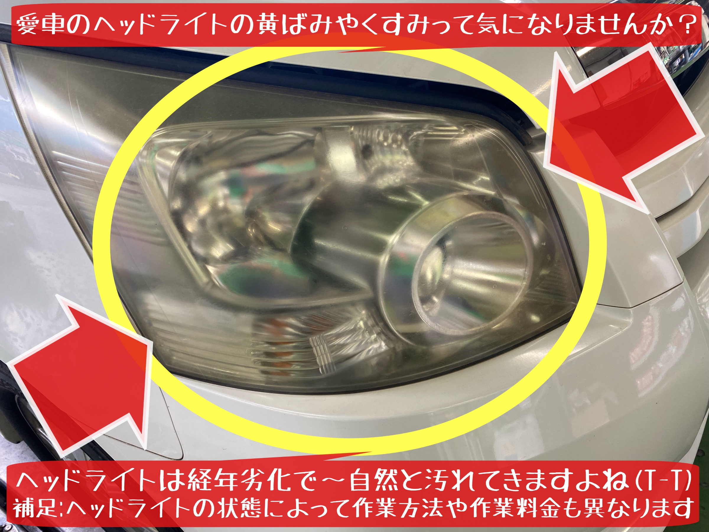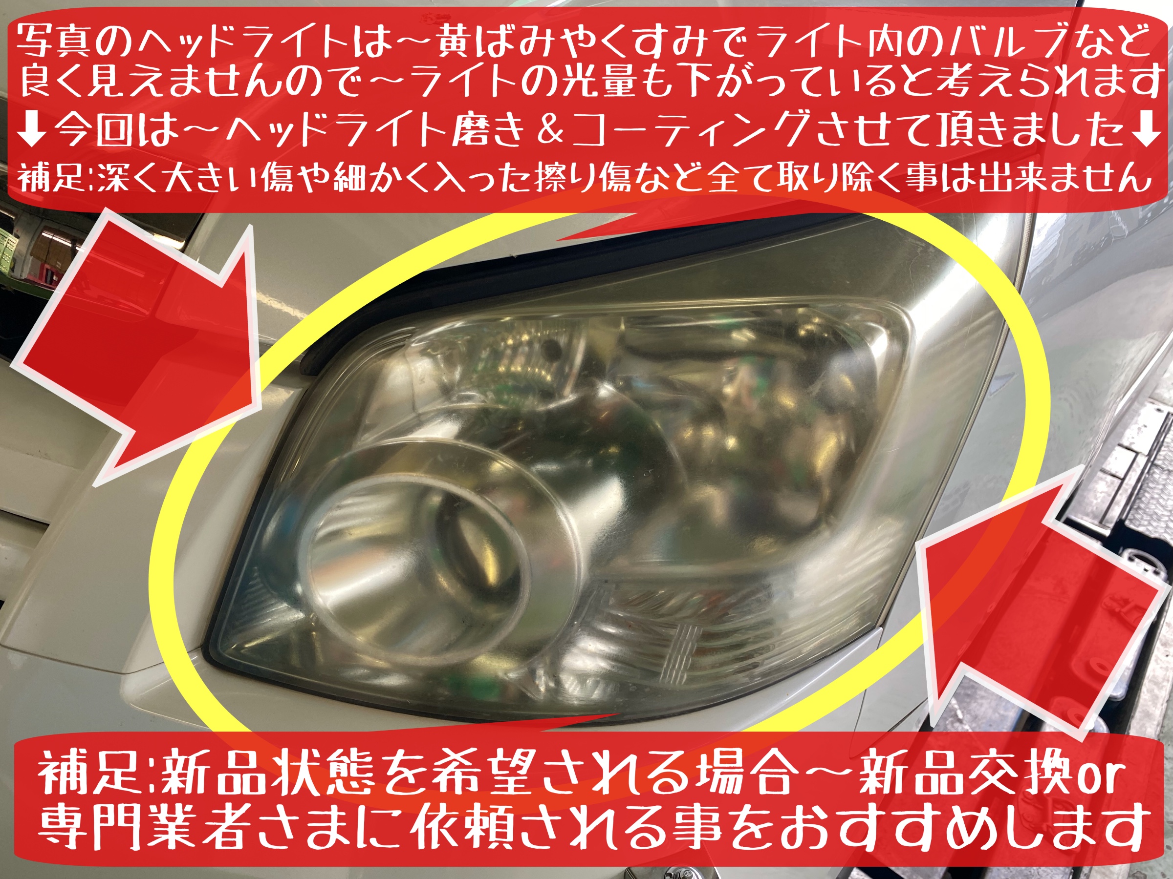 補足:①ライトの状態や作業状況によって…施工時間/施工料金は変動します ②車種やライトの状態によっては…施工出来ない場合もあります