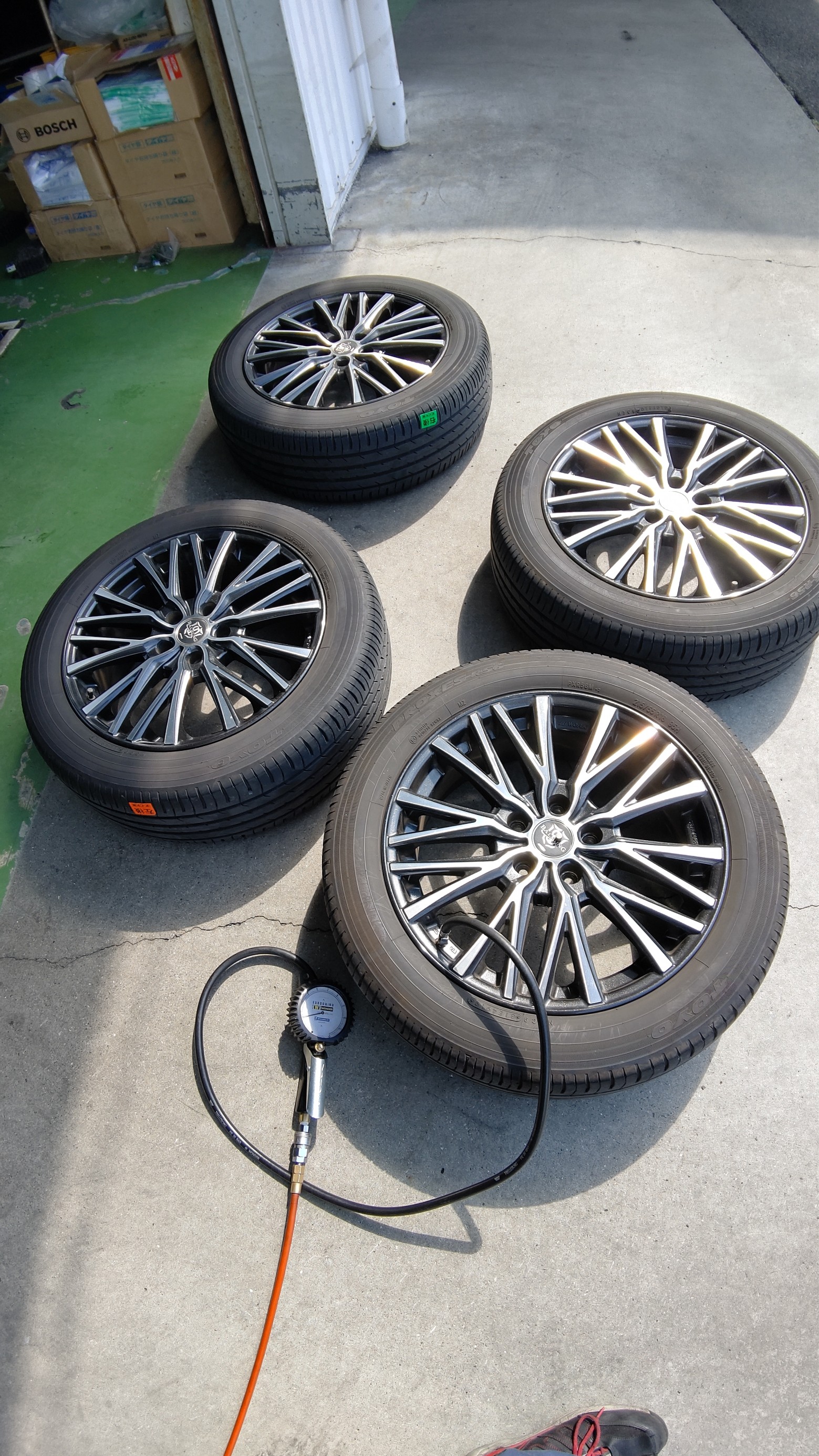 夏タイヤを下ろしてから空気圧を充填します。
