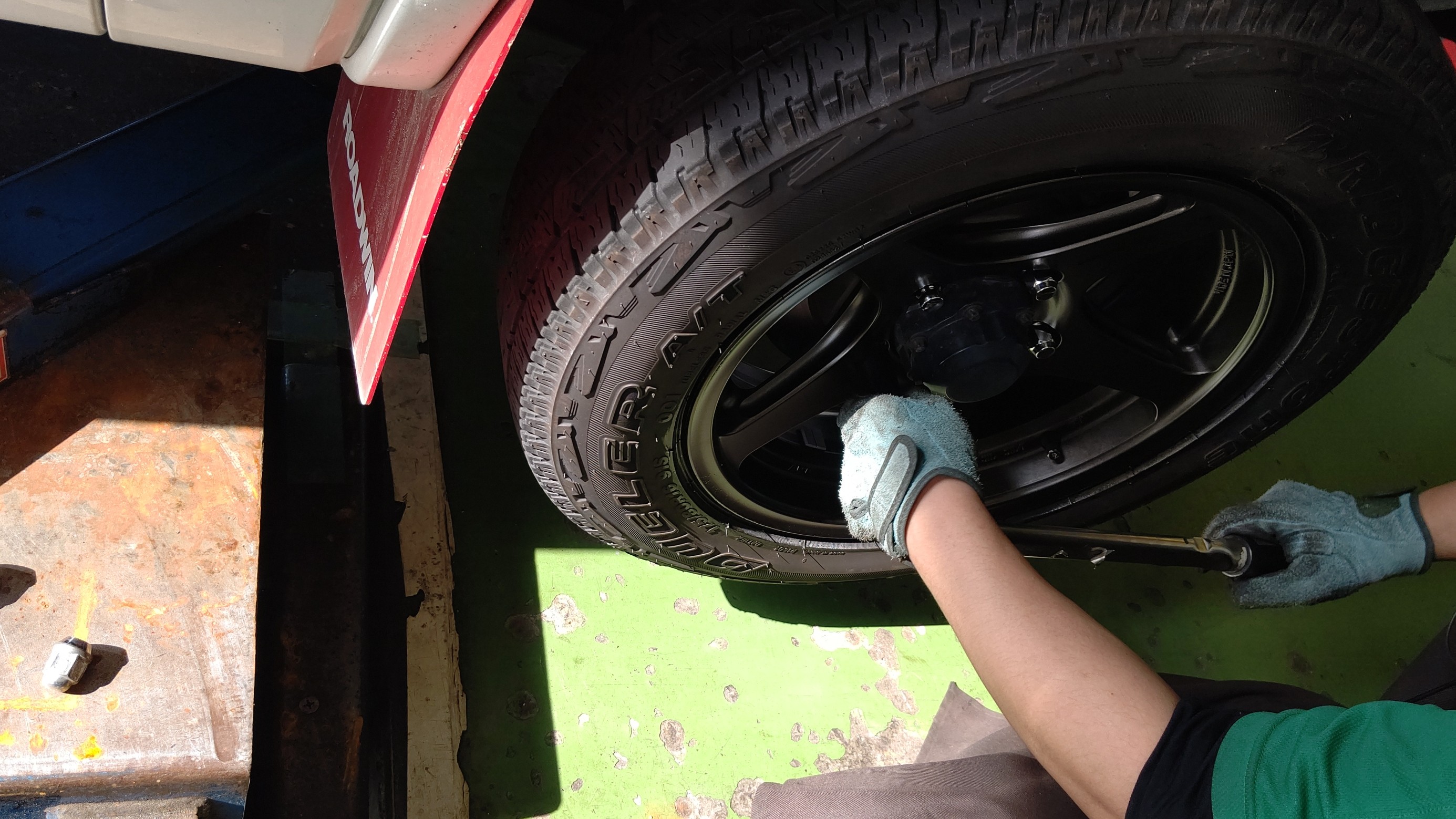 リフトアップして純正ホイールを外します。