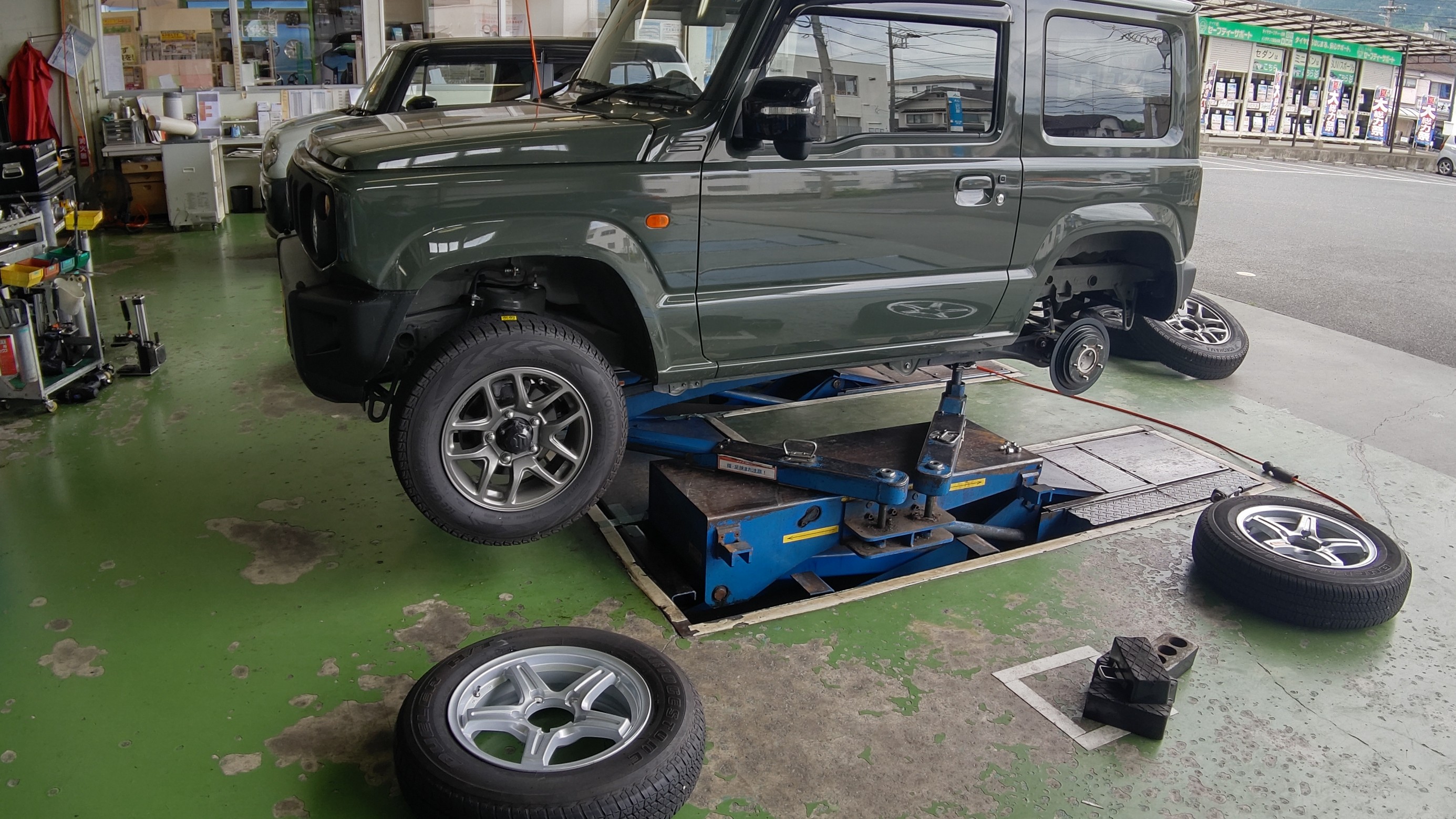 今回はジムニーのお客様の依頼でスタッドレスタイヤから夏用タイヤへと履き替えをしました。