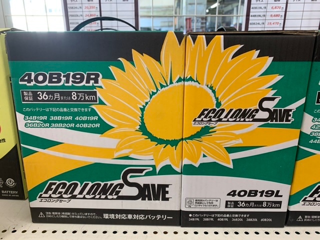 3年8万km保証がついている『エコロングセーブ』という商品になります。この他タイヤ館ではアイドリングストップ用バッテリーも含めタイプ別で各種取り扱っております。また車種によってはお取り寄せになる商品、お取り扱いのない商品もございます。詳しくは店舗スタッフまでお気軽にお尋ねください。