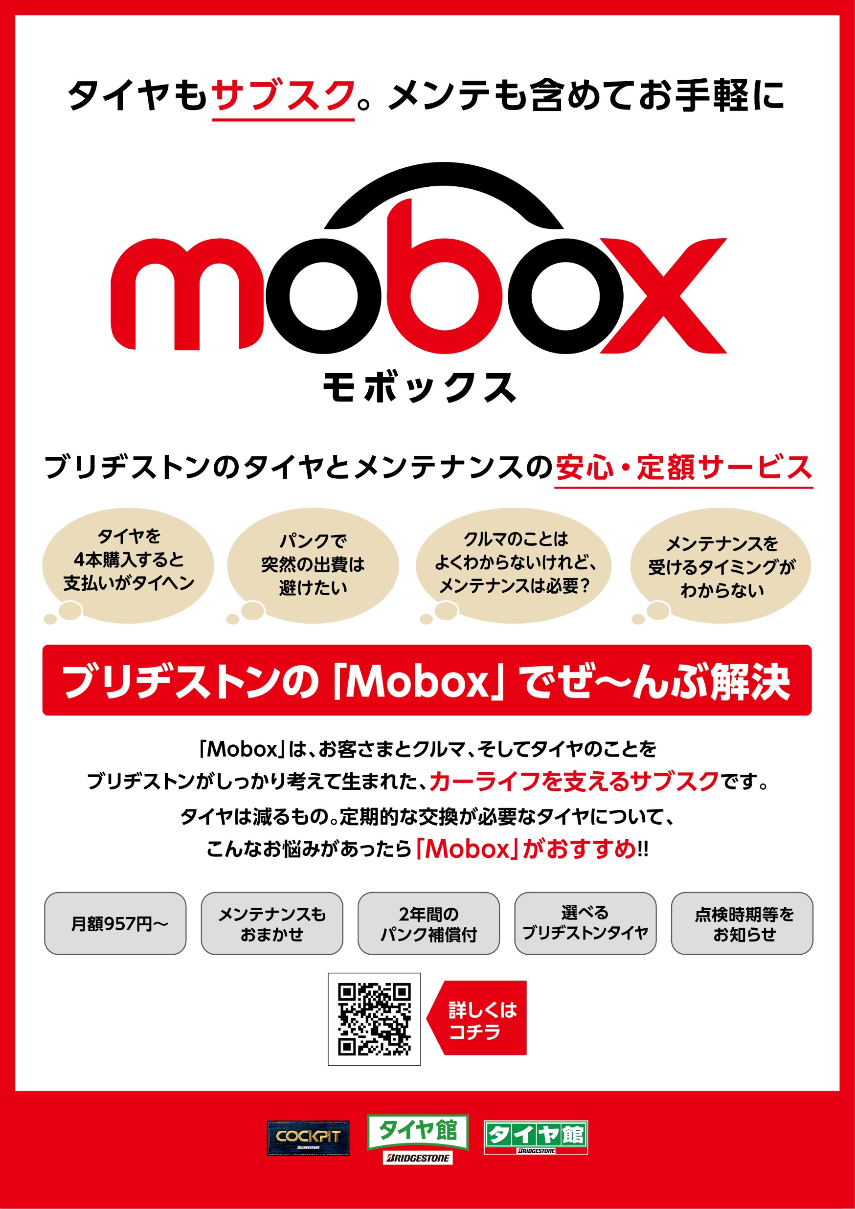 ブリヂストンの新しいタイヤサービス『Mobox』は月定額制で大きな出費になりがちなタイヤ購入のコストを平準化しもっと気軽にカーライフを楽しんで頂ける、そんなサービスとなっております。タイヤの購入だけでなく交換後もしっかりとアフターフォローいたします!各プラン・月定額のシュミレーションはこちらから。お車のメーカー・車種・型式またはタイヤサイズをご入力頂きますとお確かめ頂けます。また、店頭でのご相談もお受けしております。相談予約もWEBからして頂けますので、お気軽のご予約ください!